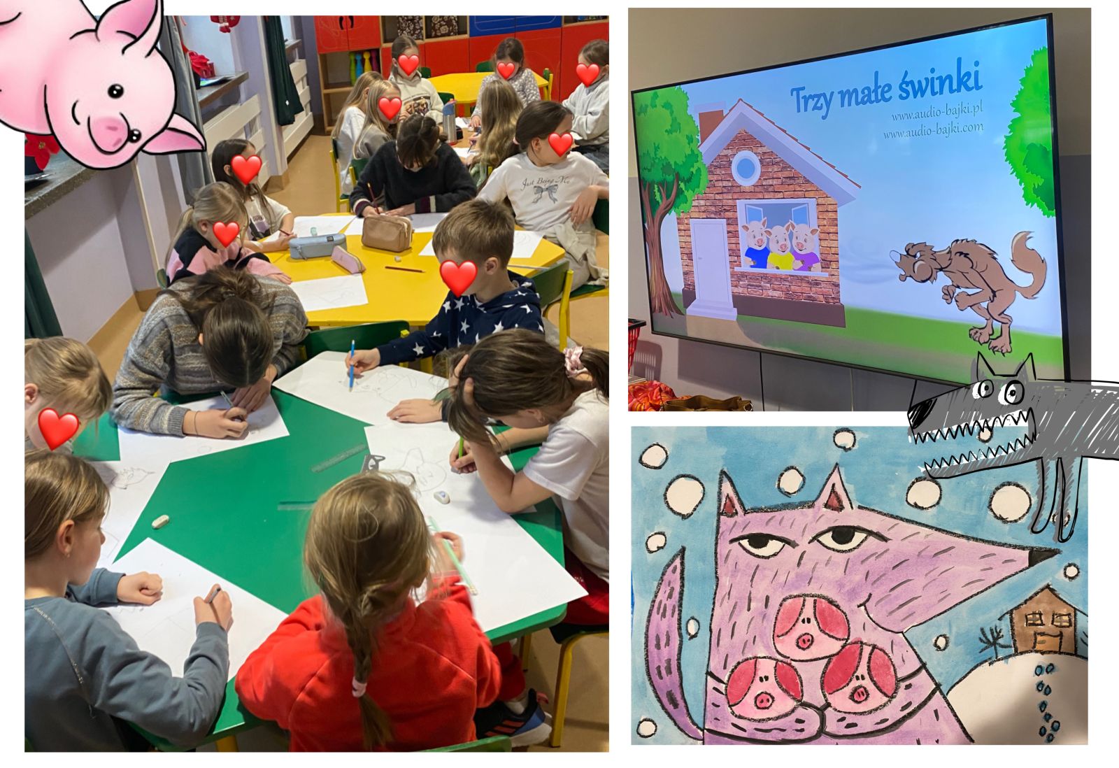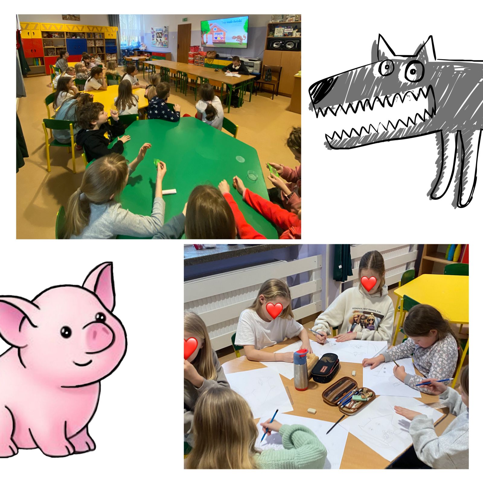 Klasyczna, znana niemal na całym świecie baśń o trzech małych świnkach stała się punktem wyjścia do refleksji nad konsekwencjami braku staranności i cierpliwości oraz nad tym, czy poczucie odpowiedzialności jest naszym sprzymierzeńcem. Oprócz wartościowej dyskusji pełnej trafnych wniosków, chętni uczniowie wykonali ilustracje przedstawiające bohaterów poznanej historii.