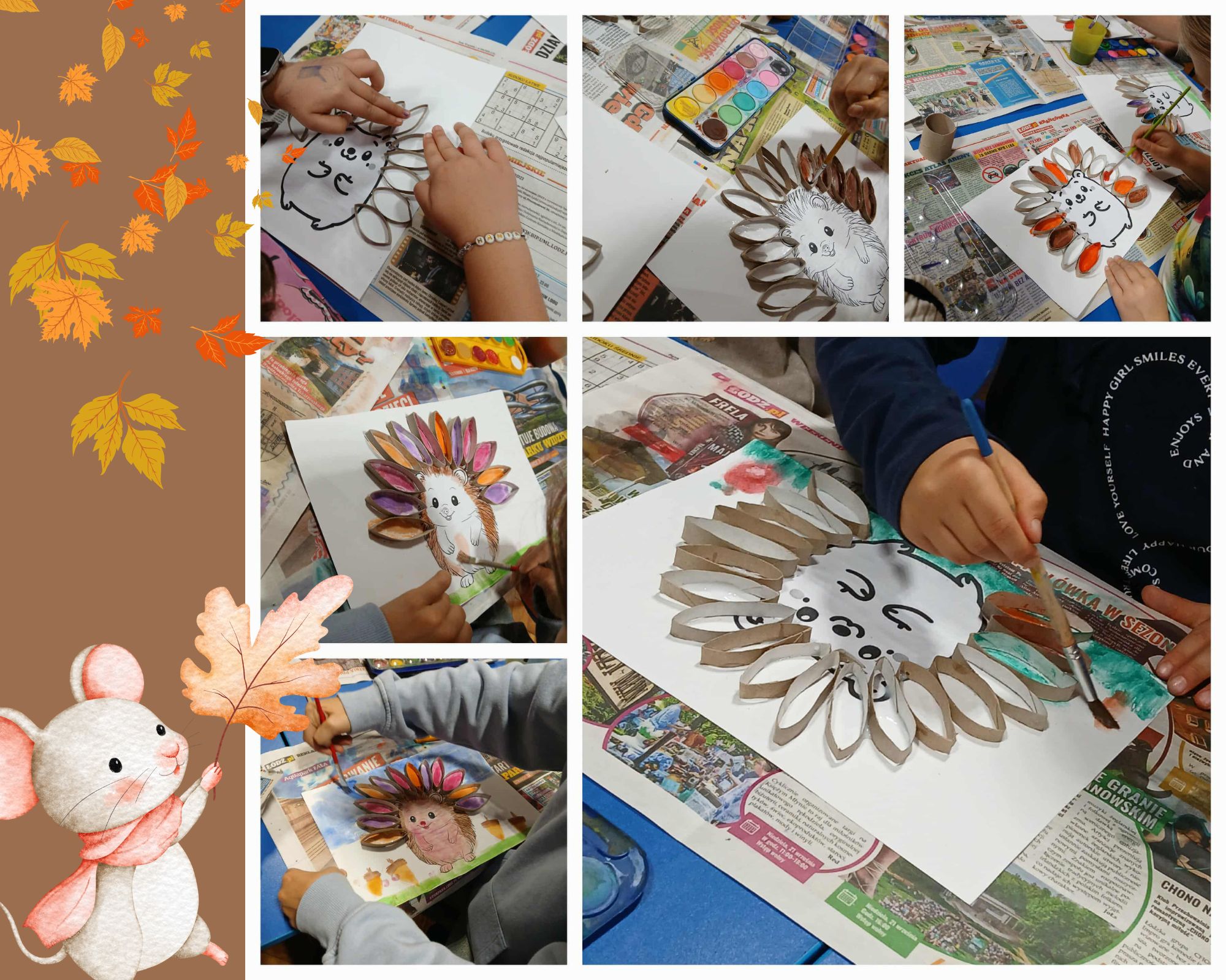Krok po kroku, w skupieniu, poznając jednocześnie ciekawostki z życia jeża, dzieci wykonały płaską pracę plastyczną, do której wykorzystały kontur jeża, rolkę po papierze toaletowym oraz farby plakatowe.