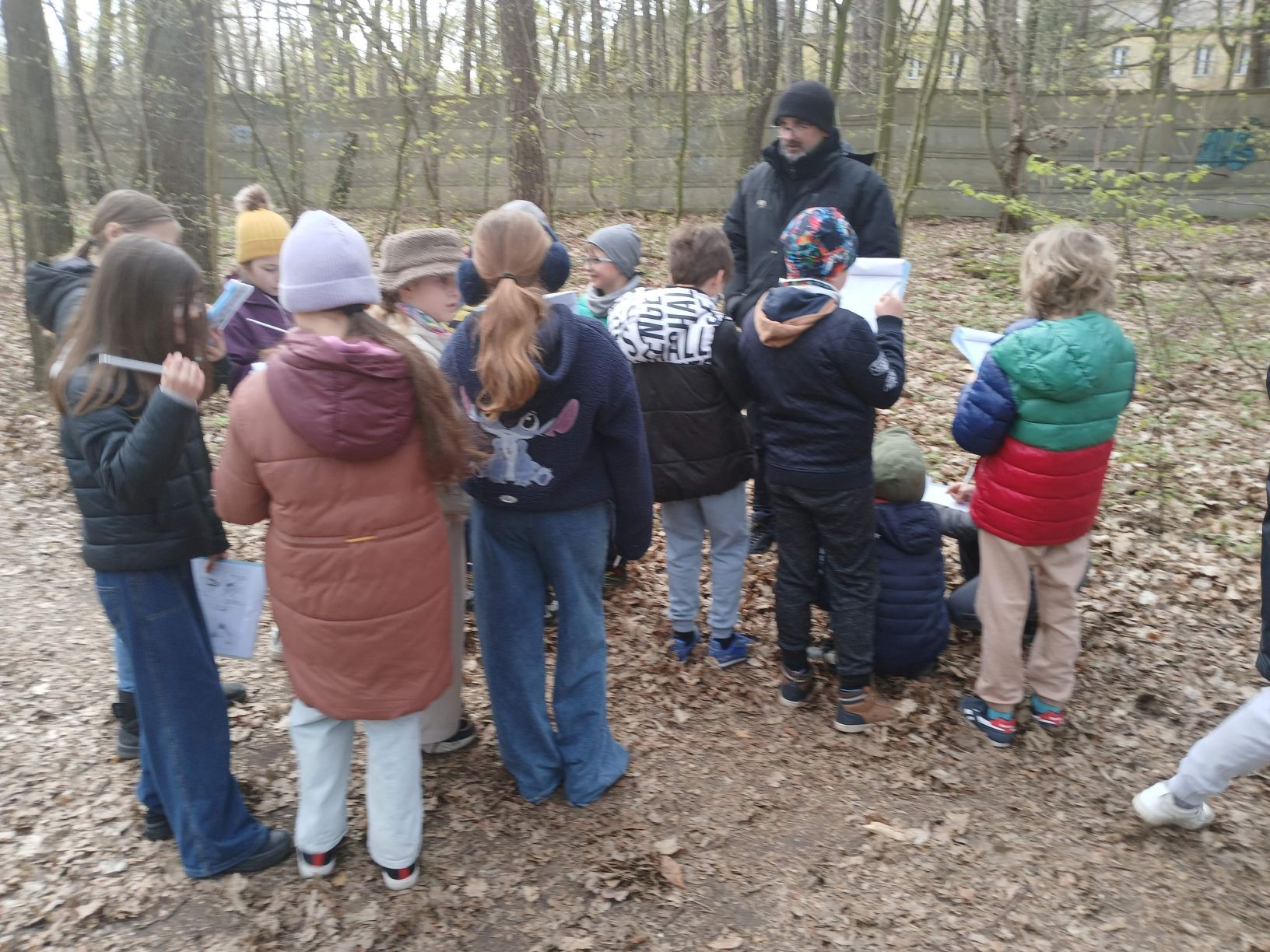Podczas spaceru uczniowie aktywnie uczestniczyli w zajęciach, wypełniając karty pracy i wykonując różne zadania. Nie zabrakło także elementów ruchowych – zabaw i wyścigów, które sprawiły dzieciom wiele radości.