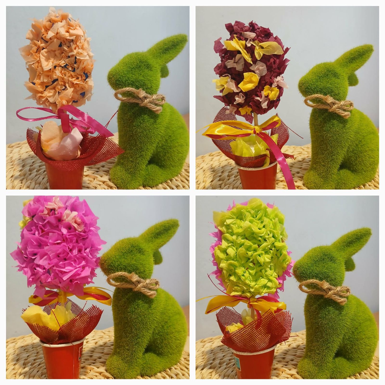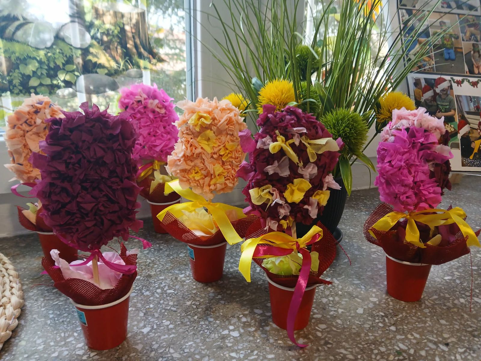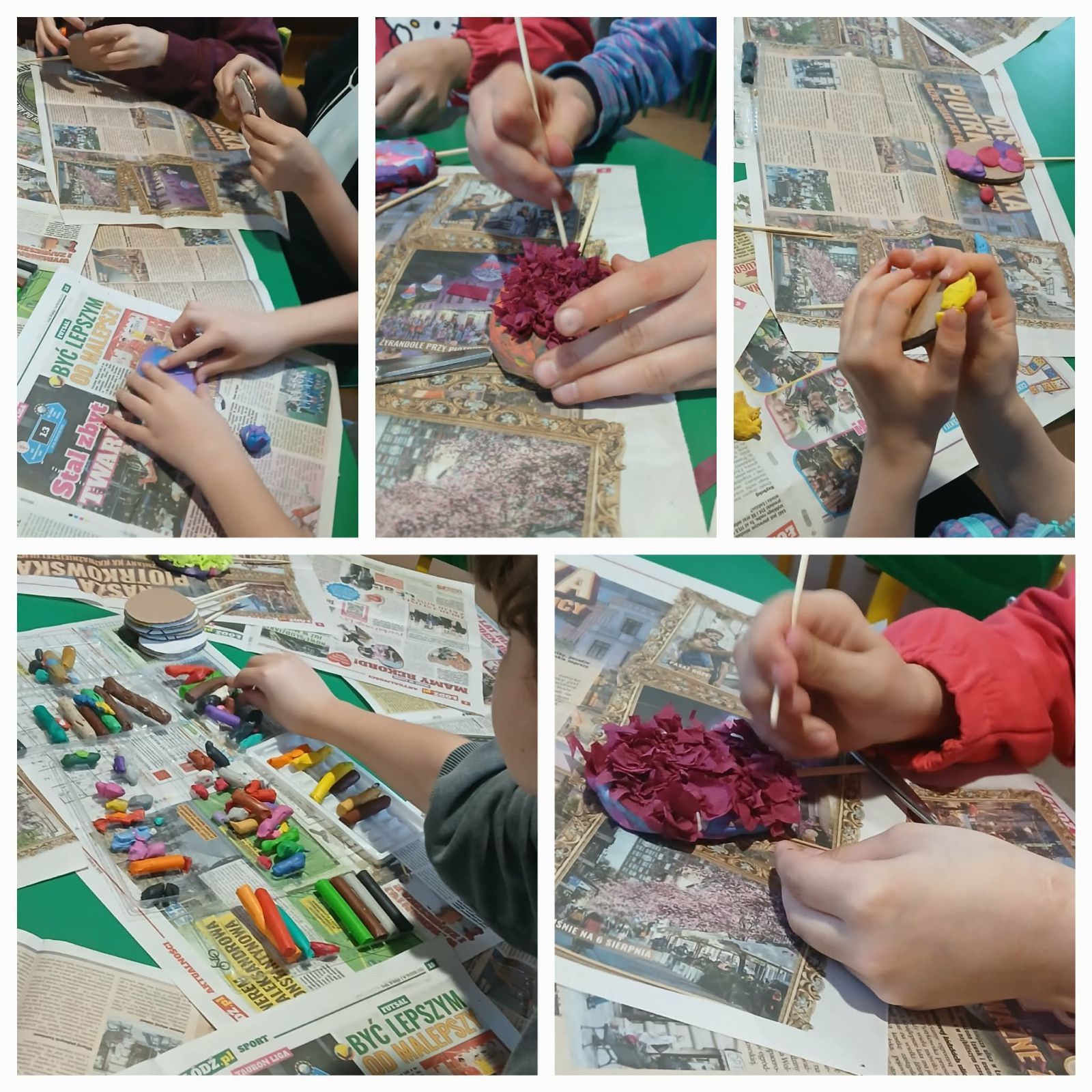 Praca polegała na formowaniu drobnych kawałków kolorowej bibuły, które następnie dzieci wbijały w plastelinę, tworząc efektowne, przestrzenne kwiaty.