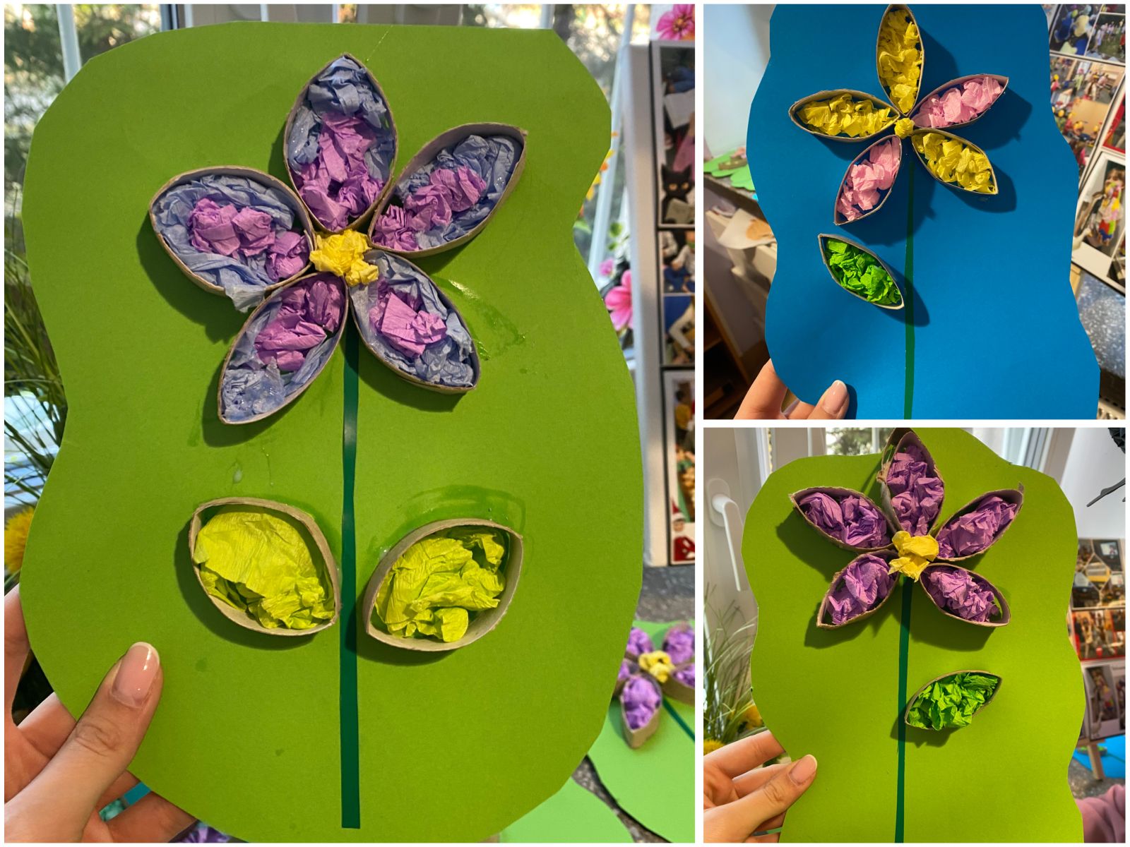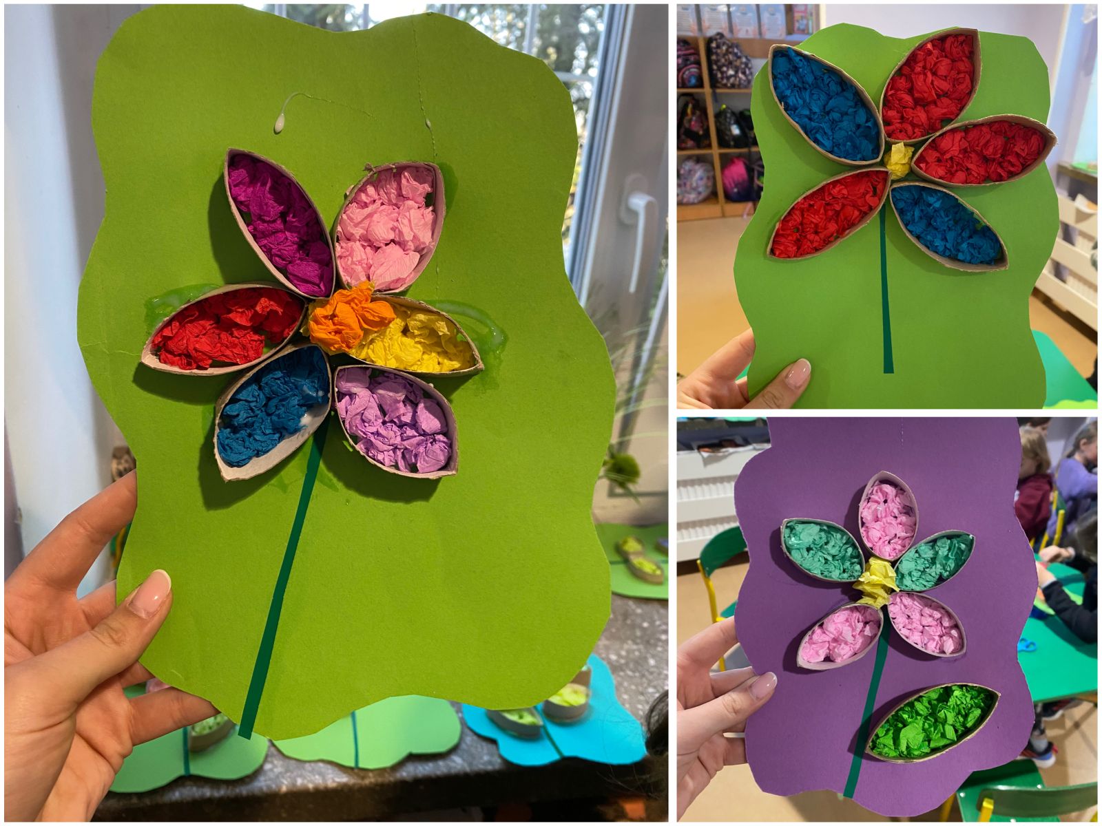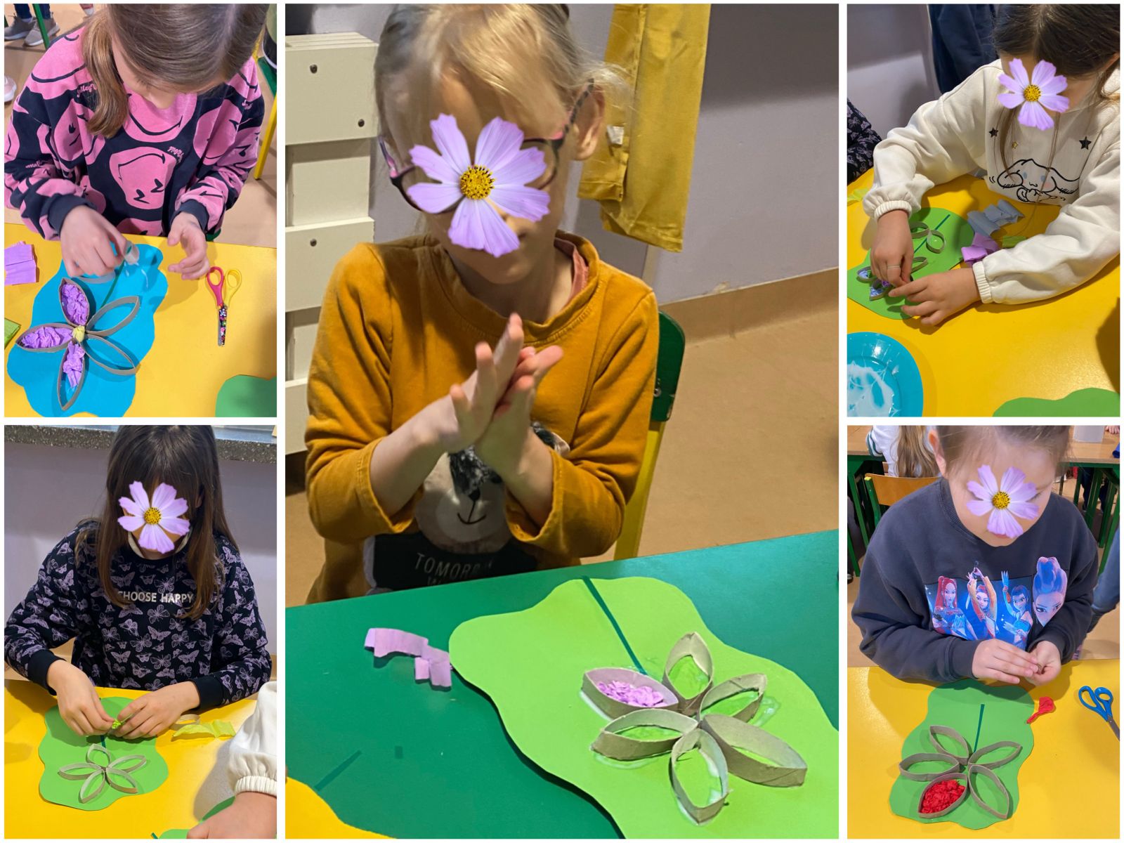 Środowy poranek spędziliśmy na wykonaniu prostej pracy plastyczno - technicznej. W centrum naszej twórczości znalazł się uniwersalny symbol piękna, życia i natury, czyli kwiaty. Do ich wykonania wykorzystaliśmy pocięte na kawałki tekturowe rolki, kolorową bibułę oraz odrobinę kolorowego papieru.