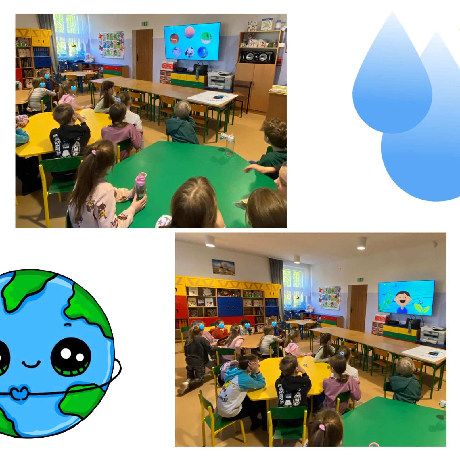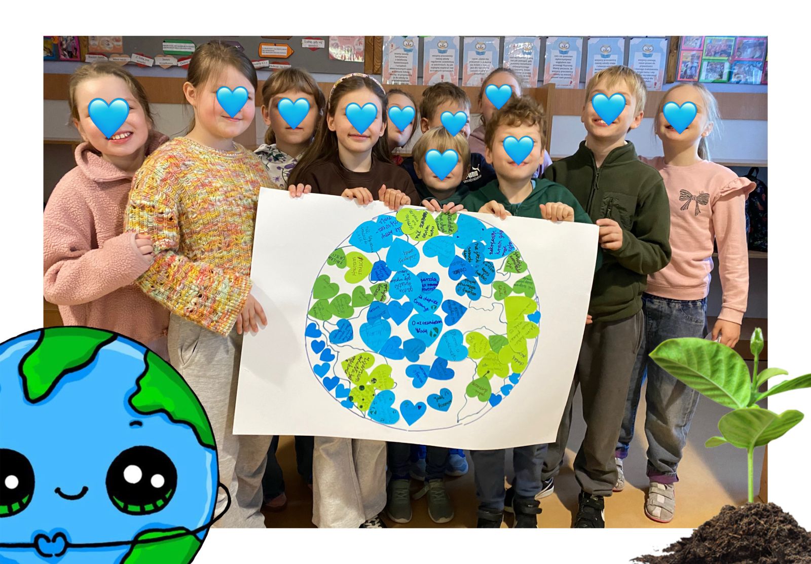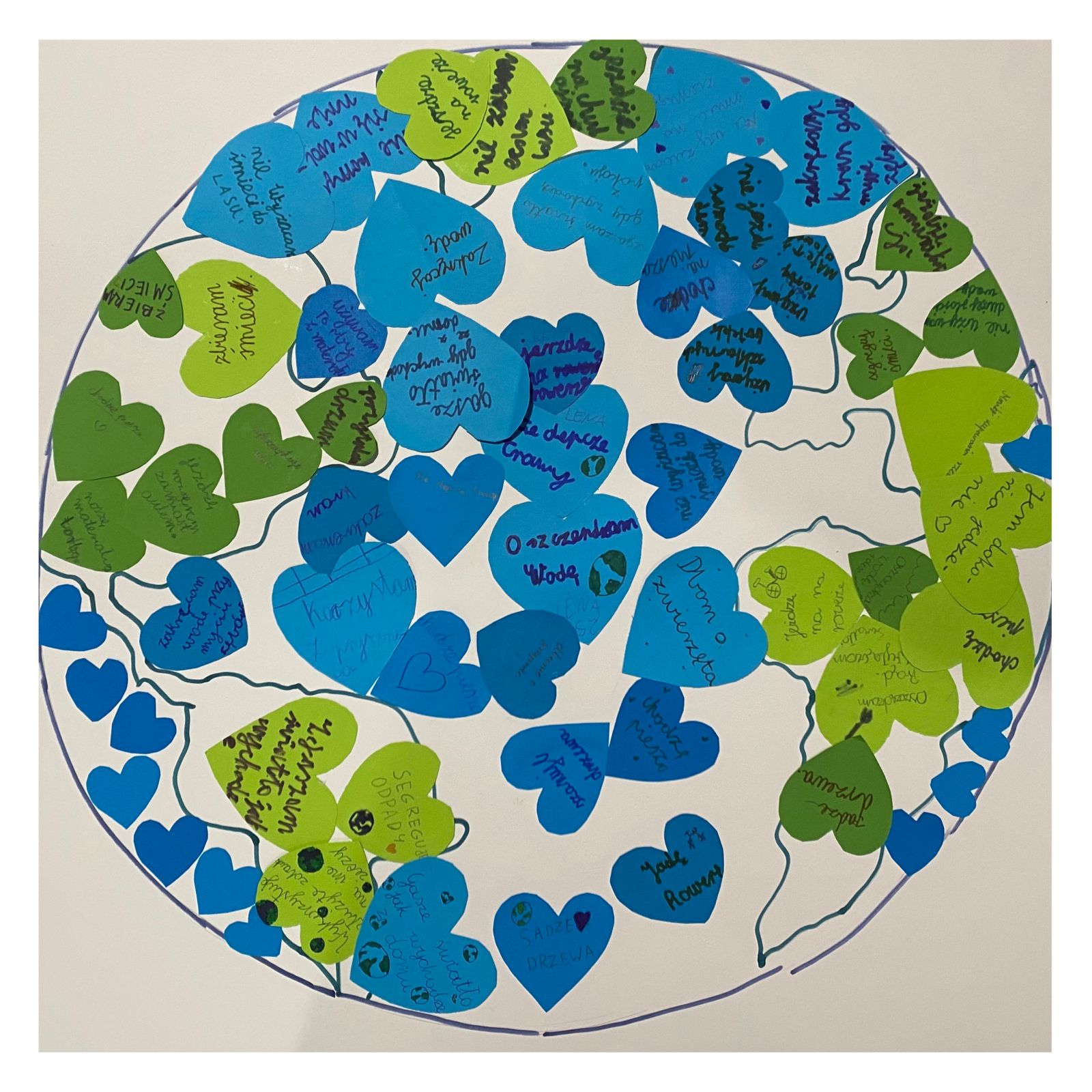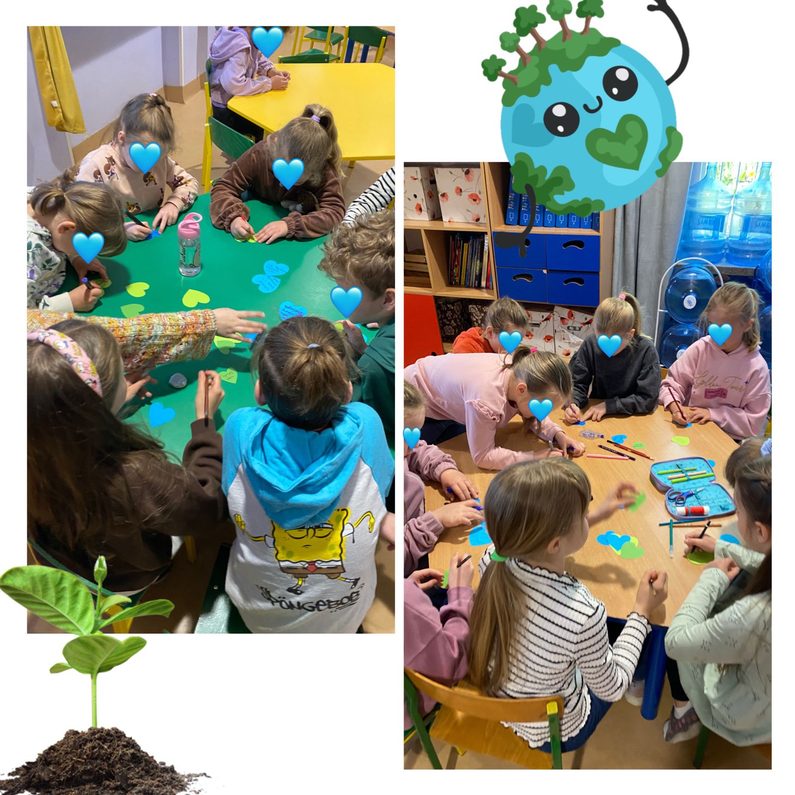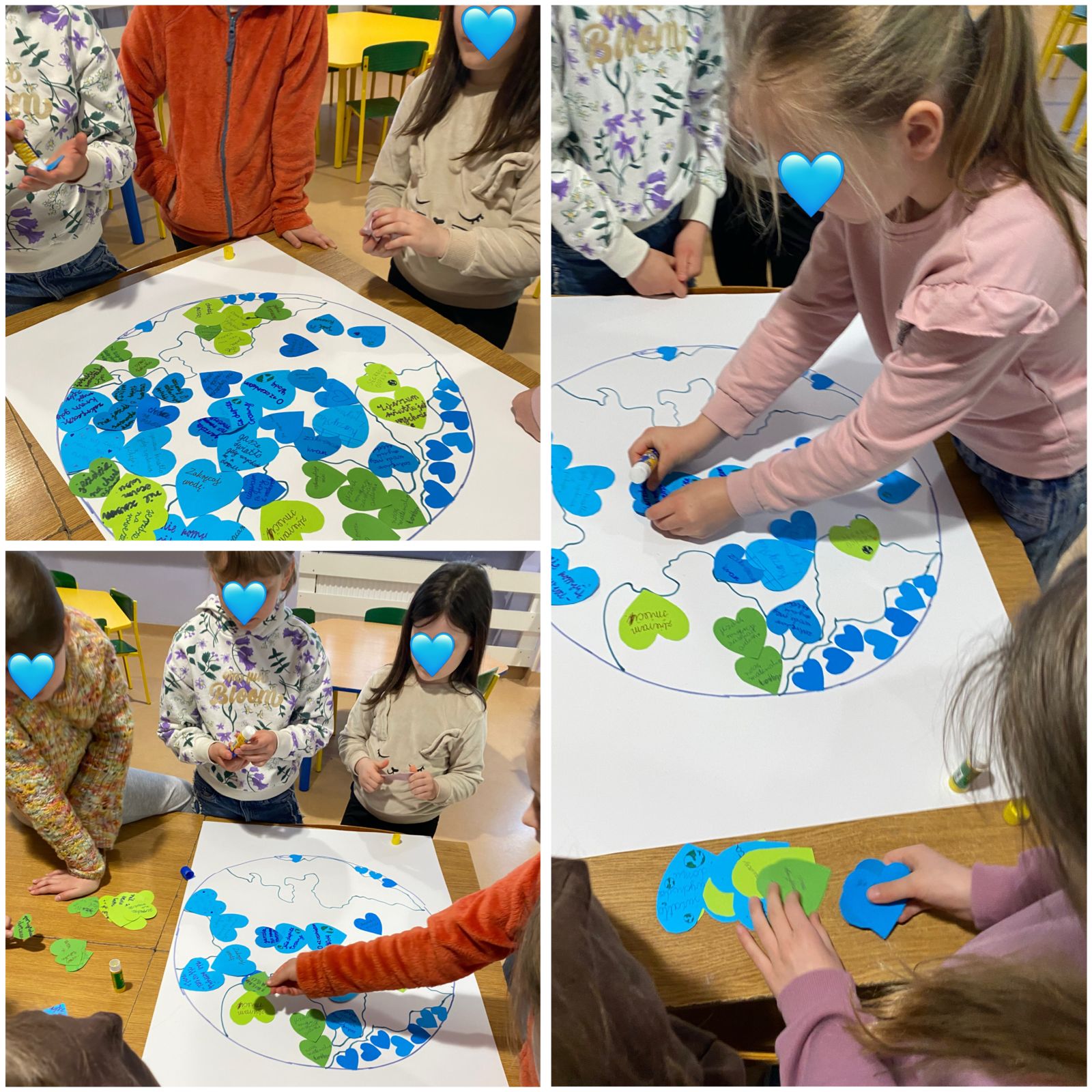 Środowy poranek upłynął nam pod znakiem obchodów Międzynarodowego Dnia Ziemi. Wspólnie obejrzeliśmy krótki film edukacyjny o postawach proekologicznych, tak ważnych we współczesnym świecie. Zastanawialiśmy się również nad odpowiedziami na pytania, takimi jak np: czy kupowanie nowych rzeczy służy naszej planecie, jaki wpływ na zwierzęta mają zmiany klimatu, czy codzienne wybory każdego z nas kształtują stan środowiska. Na zakończenie stworzyliśmy wspólną pracę – papierową planetę Ziemię, którą zapełniliśmy kolorowymi serduszkami z pomysłami na to, jak możemy troszczyć się o przyrodę.