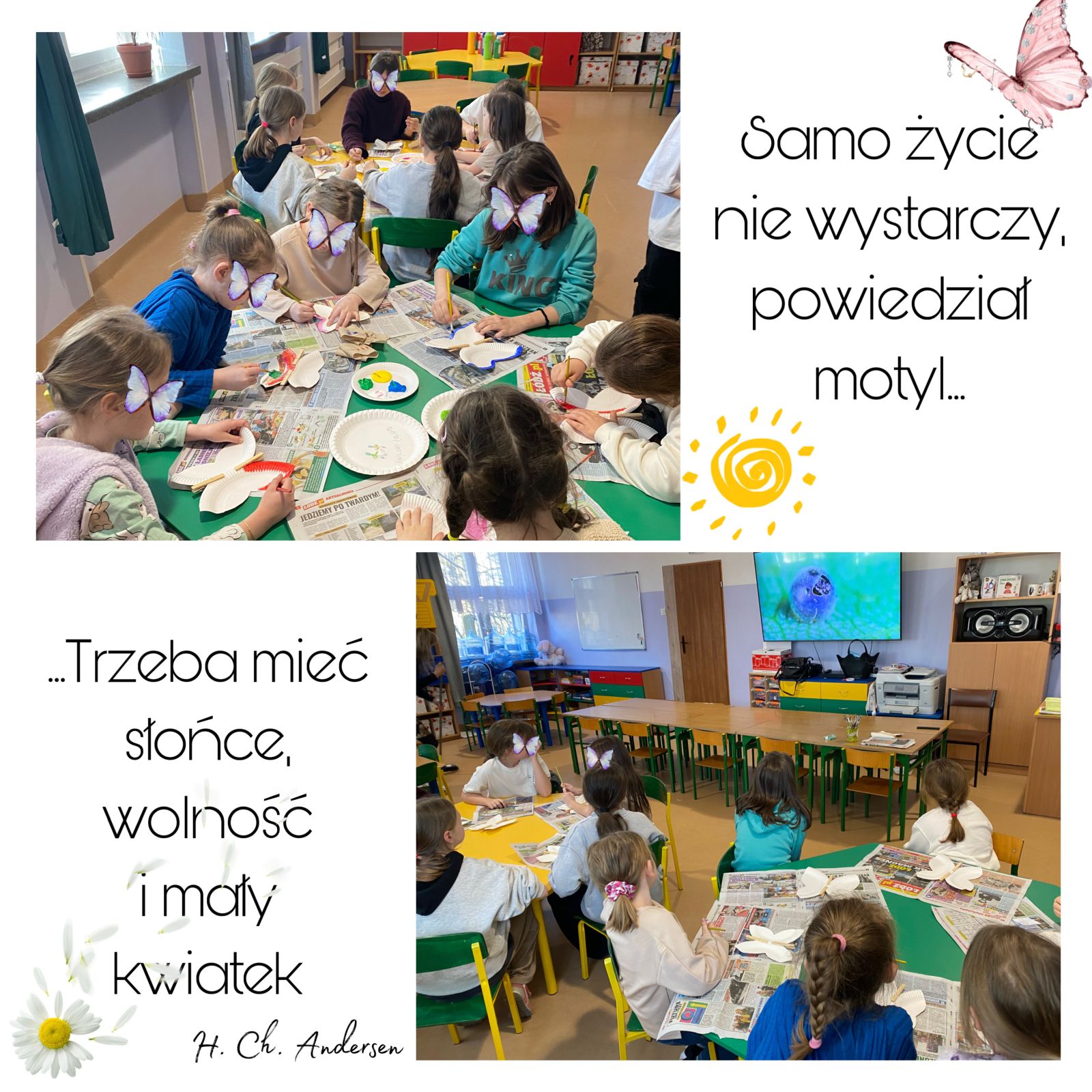Popołudniowe zajęcia minęły nam pod znakiem radości, wielu barw i twórczej aktywności. Oprócz przeistaczania białych papierowych talerzyków i drewnianych spinaczy w kolorowe, niczym z baśni Andersena motyle, przyjrzeliśmy się także cyklowi życia tych fascynujących owadów, który choć krótki, skrywa wiele tajemnic. Rozmawialiśmy również o tym, jak ogromne znaczenie dla ochrony motyli mają codzienne działania podejmowane w przydomowych ogródkach, takie jak ograniczenie koszenia trawnika, rezygnacja z pestycydów czy sadzenie roślin miododajnych.