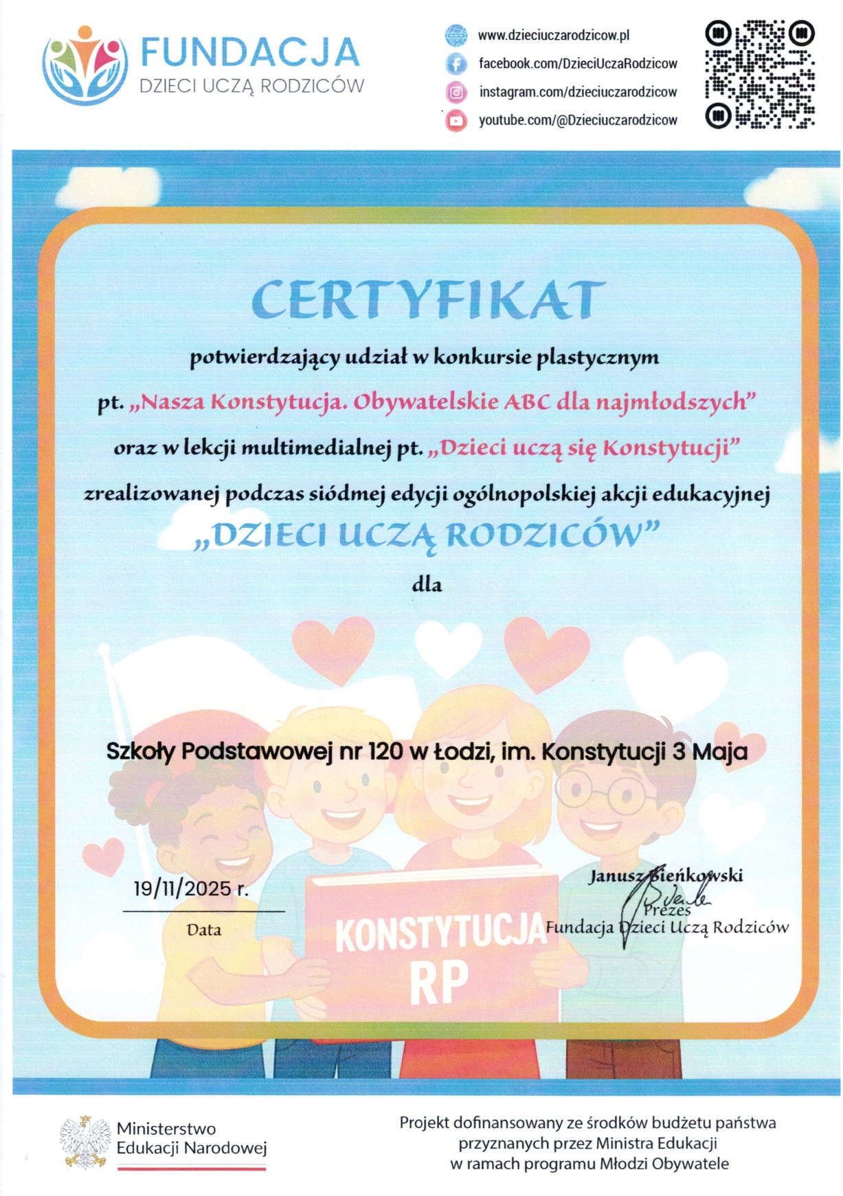 Ich zadaniem było także przygotowanie pracy plastycznej zainspirowanej tematami Konstytucji Rzeczypospolitej Polskiej. Praca ta została doceniona poprzez przyznanie szkole certyfikatu. Gratulujemy uczniom!