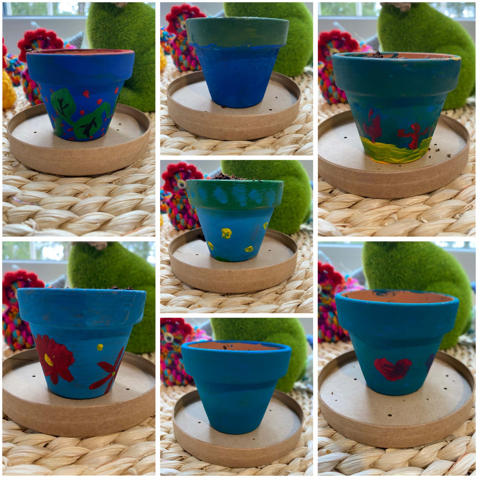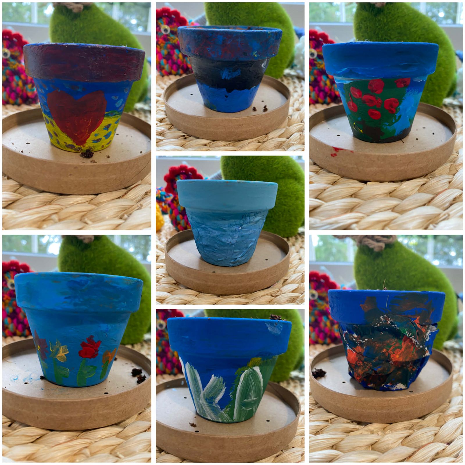 Każde dziecko malowało doniczkę farbami według własnego pomysłu, wykorzystując różnorodne kolory i wzory. Powstały wyjątkowe i bardzo kreatywne prace, które odzwierciedlały indywidualność małych artystów.