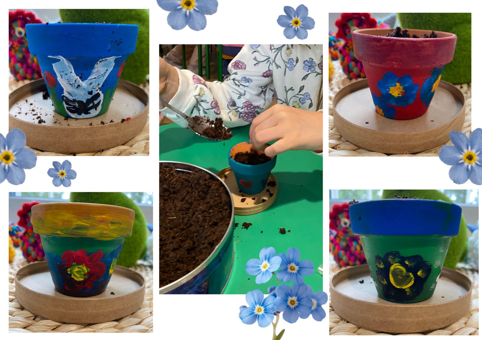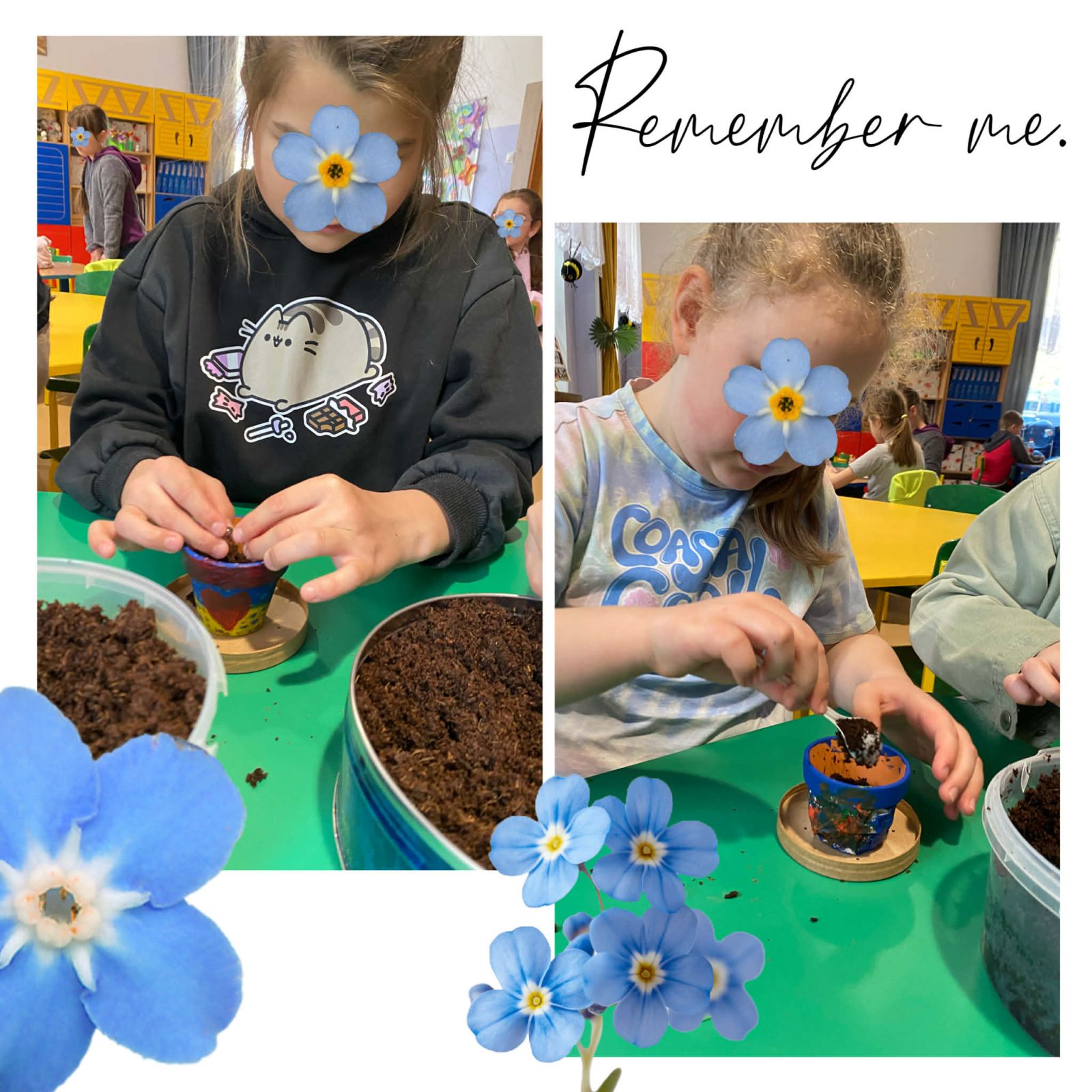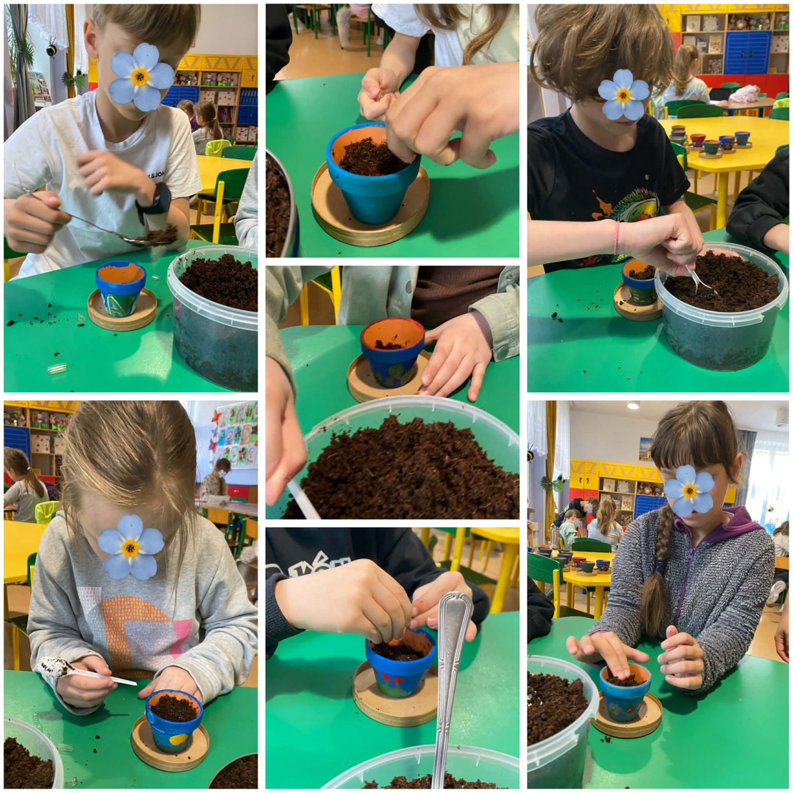 Po zakończeniu części plastycznej dzieci przystąpiły do kolejnego etapu – sadzenia roślin. Do przygotowanych doniczek wsypywały ziemię, a następnie siały nasiona niezapominajek. Zajęcia były nie tylko okazją do rozwijania zdolności manualnych, ale także do nauki odpowiedzialności i troski o rośliny. Dzieci dowiedziały się, czego potrzebują rośliny, aby rosnąć, oraz jak należy o nie dbać.