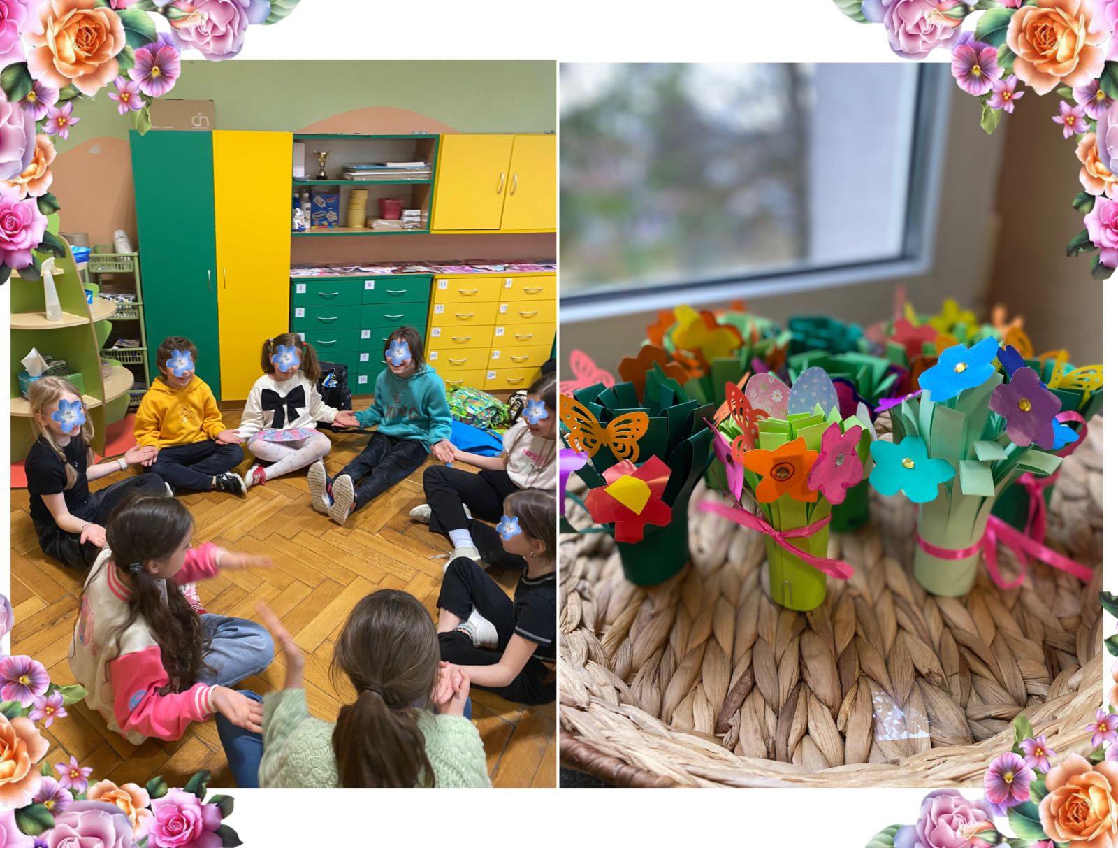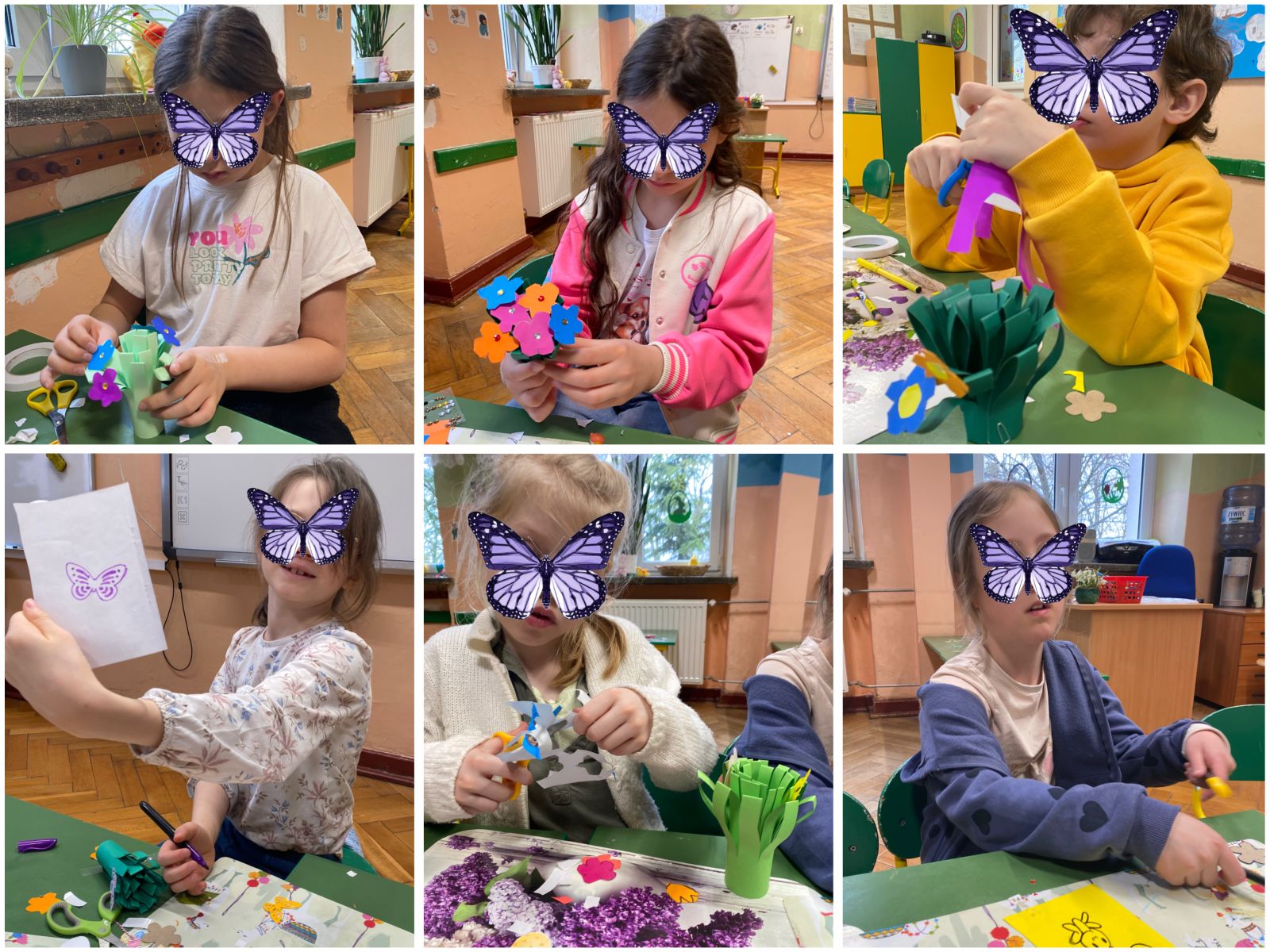 Podczas kolejnych zajęć chętni uczniowie wykonali przestrzenne kolorowe bukieciki, wykorzystując nowo poznaną technikę składania i formowania papieru. Dzieci z dużym zaangażowaniem tworzyły kompozycje kwiatowe, dobierając barwy i kształty według własnych pomysłów. Efektem pracy były urocze, trójwymiarowe bukiety, które wprowadziły radosny, wiosenny nastrój.