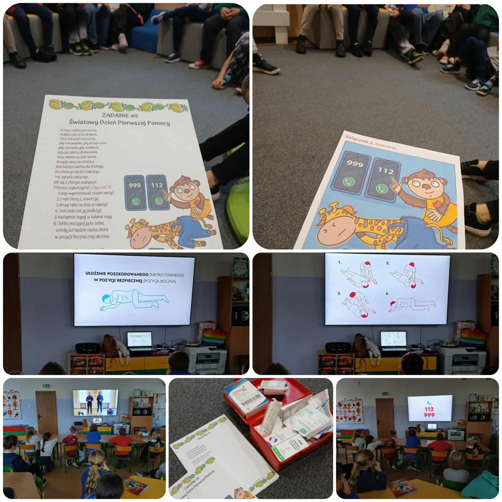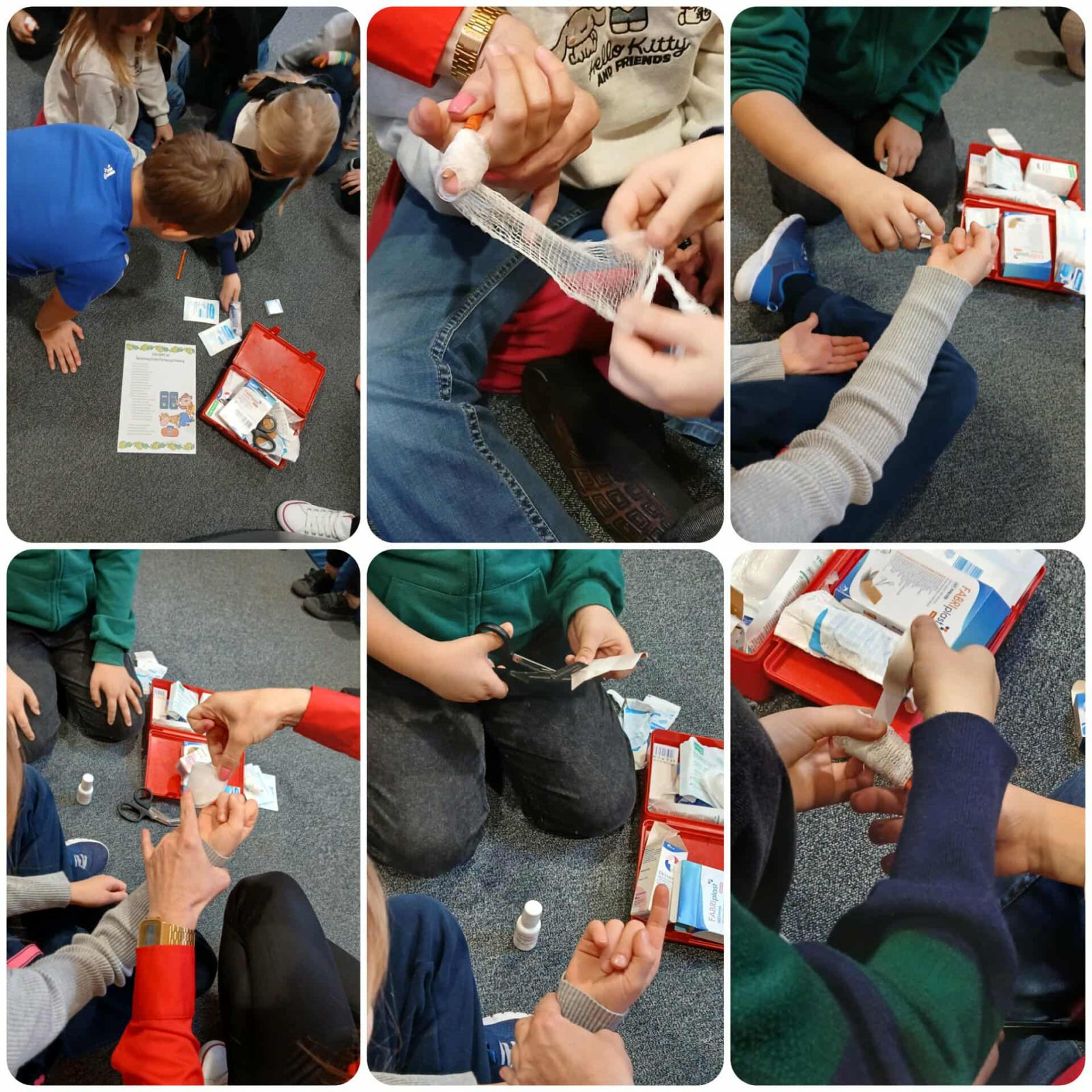 Jak wezwać pomoc? Czy zawsze w pierwszej kolejności dzwonimy na numer 112 czy może 999? Co zrobić, gdy ktoś zasłabnie na słońcu? Na te i wiele innych pytań odpowiedzieliśmy podczas zajęć omawiających pierwszą pomoc przedmedyczną. Warsztaty miały typowo praktyczny charakter. Nasi uczniowie odgrywali scenki, ćwiczyli bandażowanie, wezwanie pomocy i ułożenie poszkodowanego w pozycji bocznej bezpiecznej. Temat ważny i poważny, dzięki udziałowi w projekcie edukacyjny zrealizowany w sposób przystępny a przed wszystkim atrakcyjny dla dzieci.