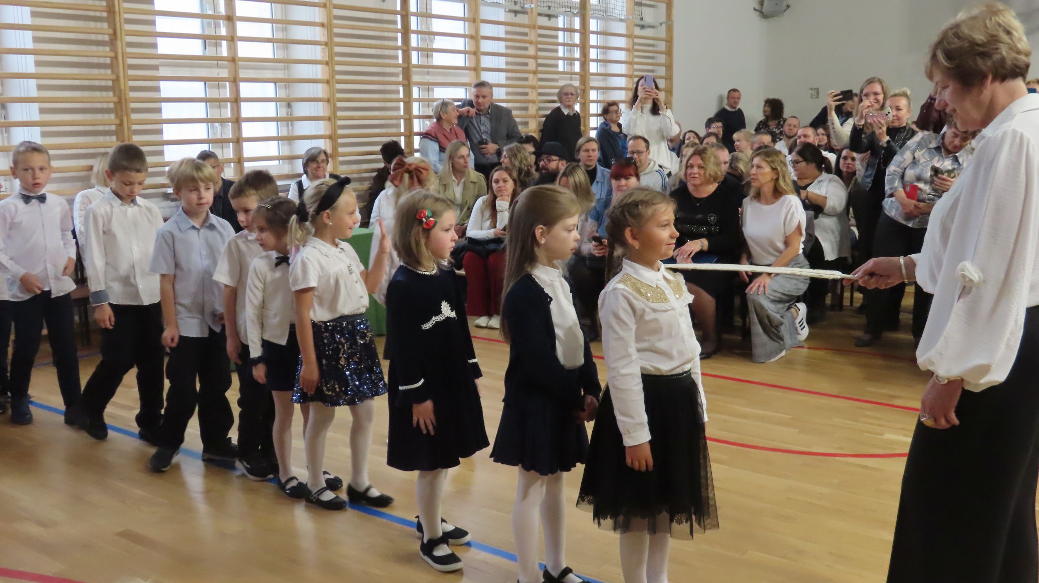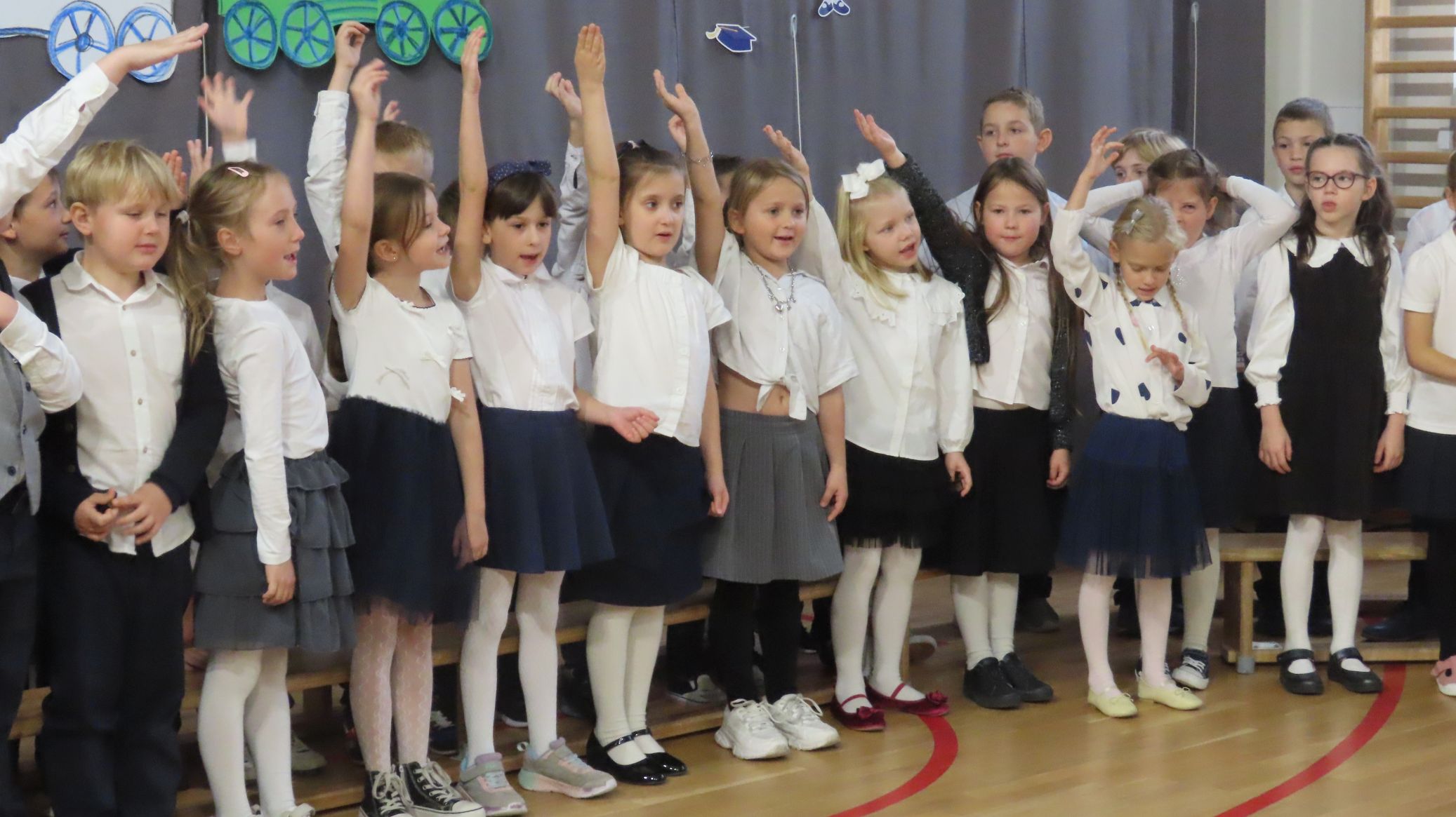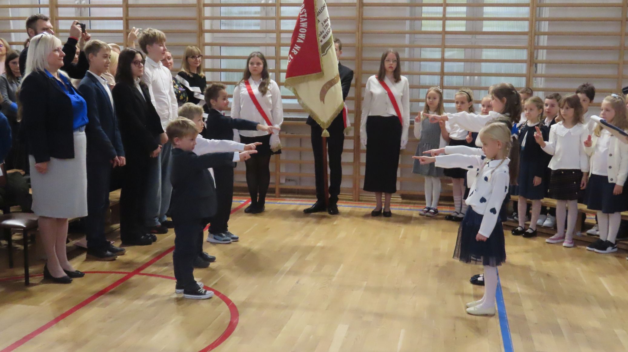 Nie zabrakło też części artystycznej - pierwszoklasiści wykazali się umiejętnościami recytacji wierszyków i śpiewu piosenek. Wspaniale zaprezentowali także nasz taniec narodowy - polonez. Występy uczniów spotkały się z entuzjazmem i aprobatą publiczności. Cała uroczystość zakończyła się wspólnym zdjęciem, zasadzeniem symbolicznych krzewów forsycji i słodkim poczęstunkiem. Ten dzień na długo pozostanie w pamięci naszych uczniów - był pełen wzruszeń, radości i dumy.