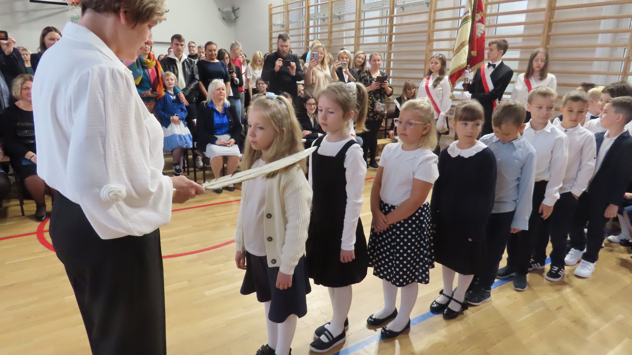 Najważniejszym momentem uroczystości było złożenie ślubowania na sztandar szkoły oraz pasowanie symbolicznym piórem każdego ucznia przez panią dyrektor - Dorotę Pocheć.