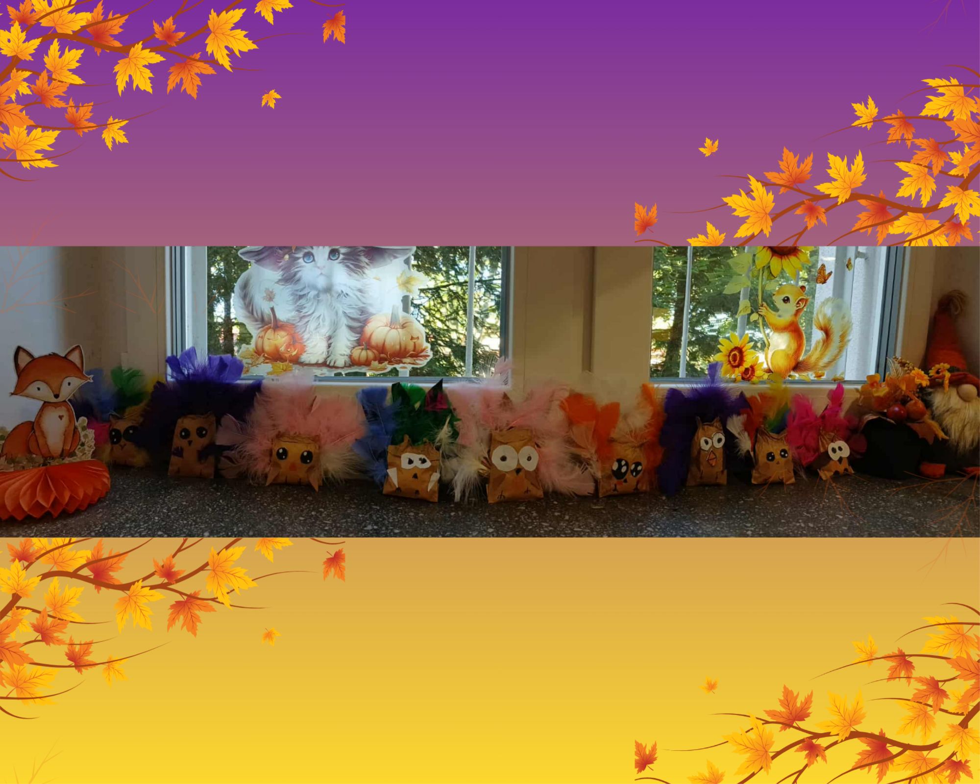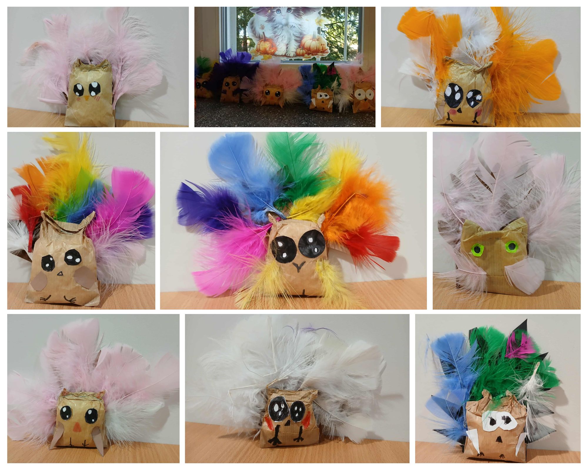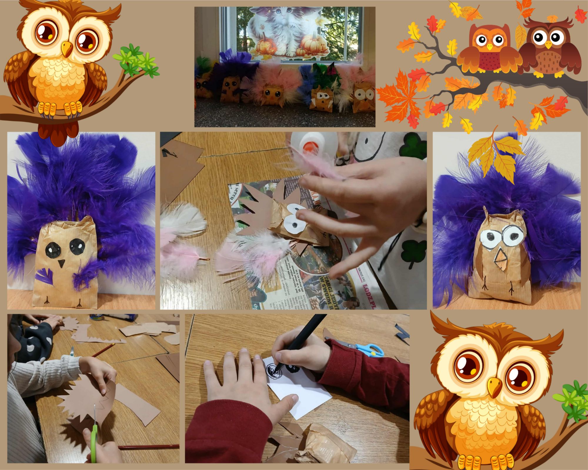 Dzieci wykonały sówki wykorzystując do tego papierową torebkę, i kolorowe piórka. Brzuch sówki wypełniły watą, a następnie formowały uszy i doklejały przygotowane wcześniej oczy i skrzydła.