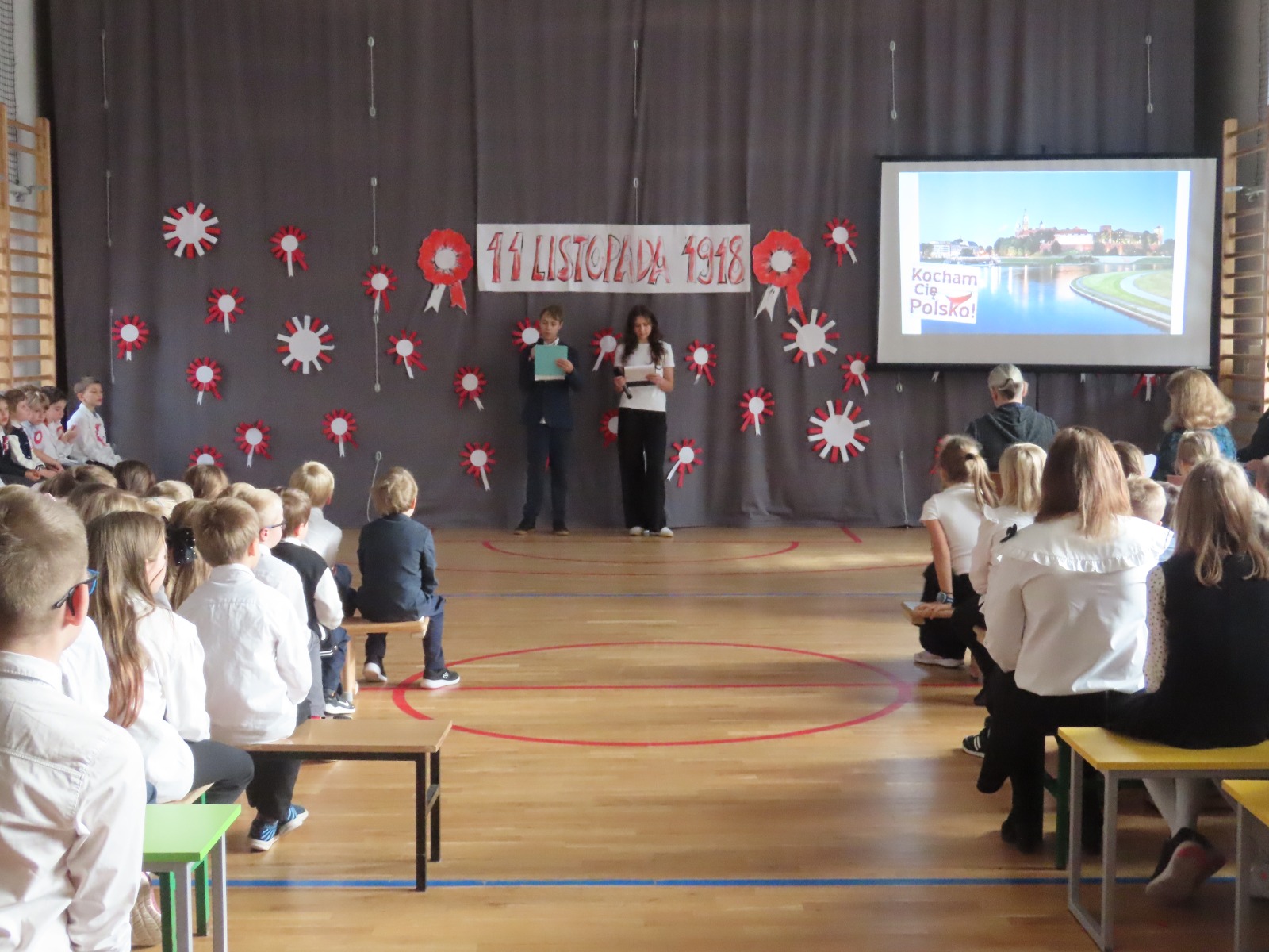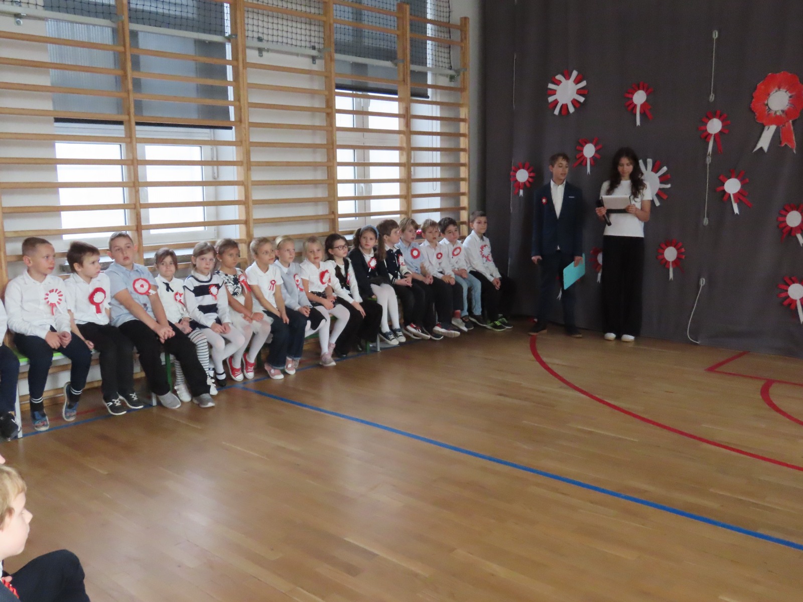 Uczniowie klas I–IV zaprezentowali program artystyczny pt. „Polskie abecadło”, przybliżający najmłodszym symbole narodowe i wartości patriotyczne.