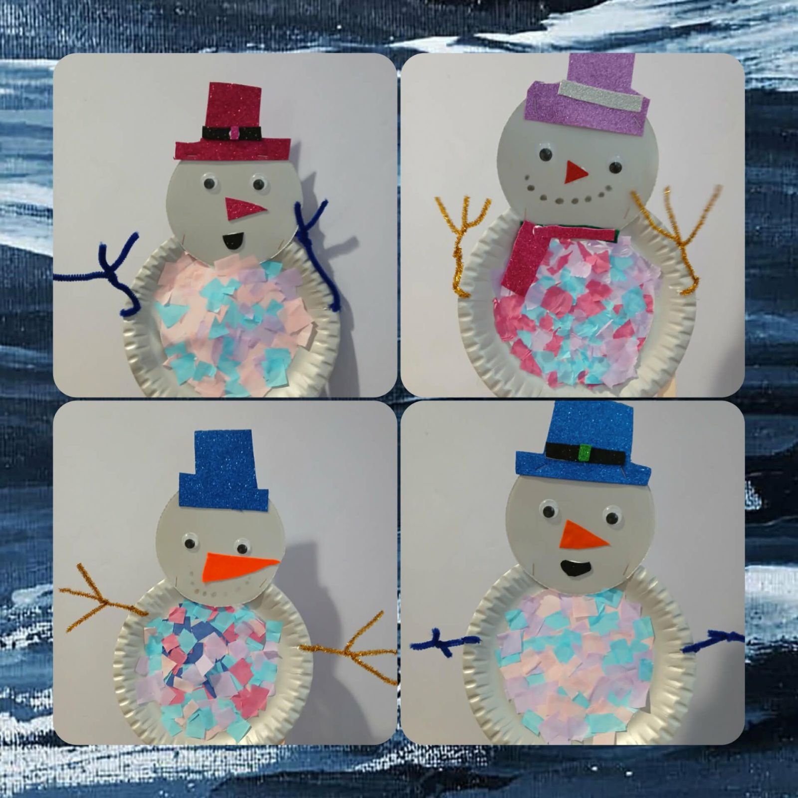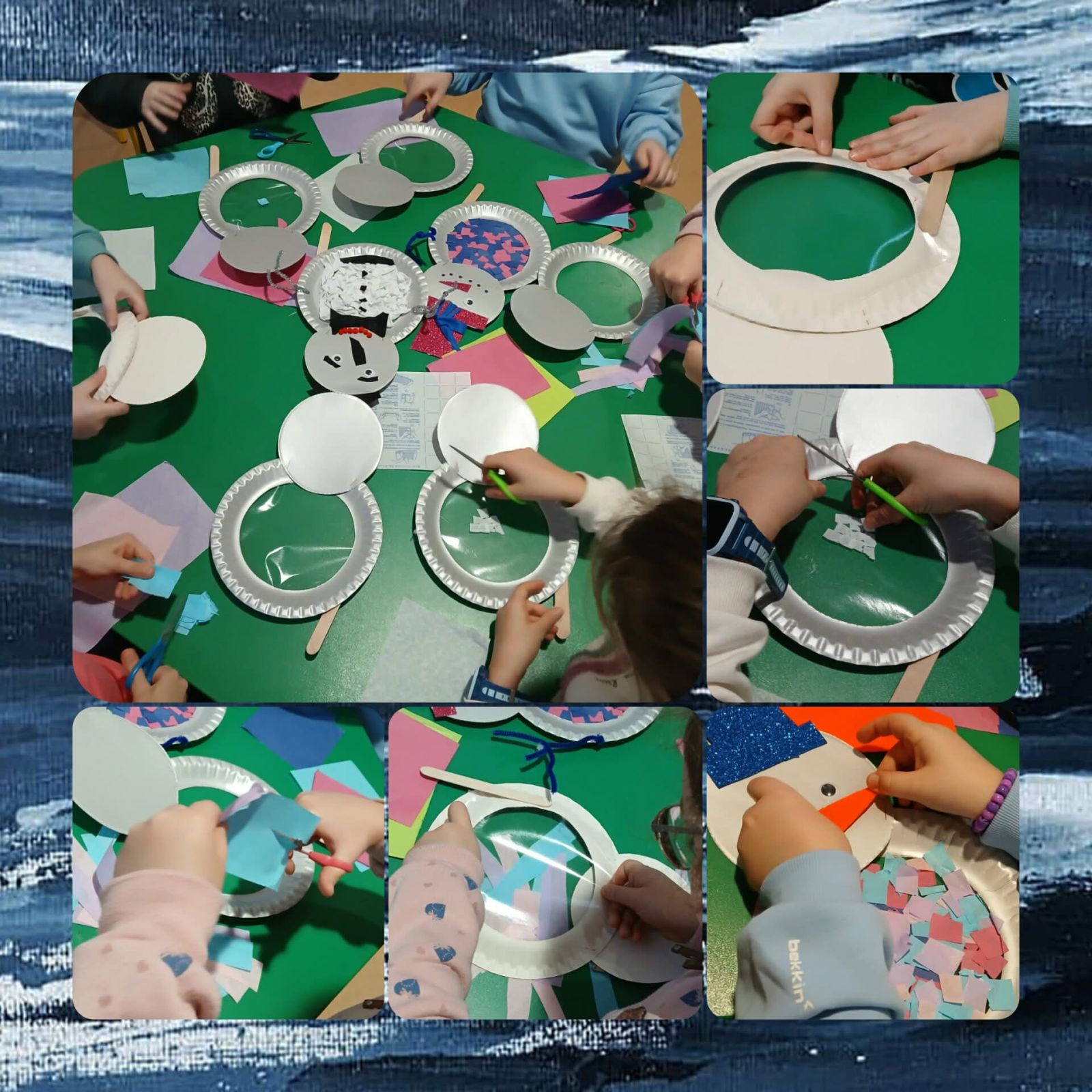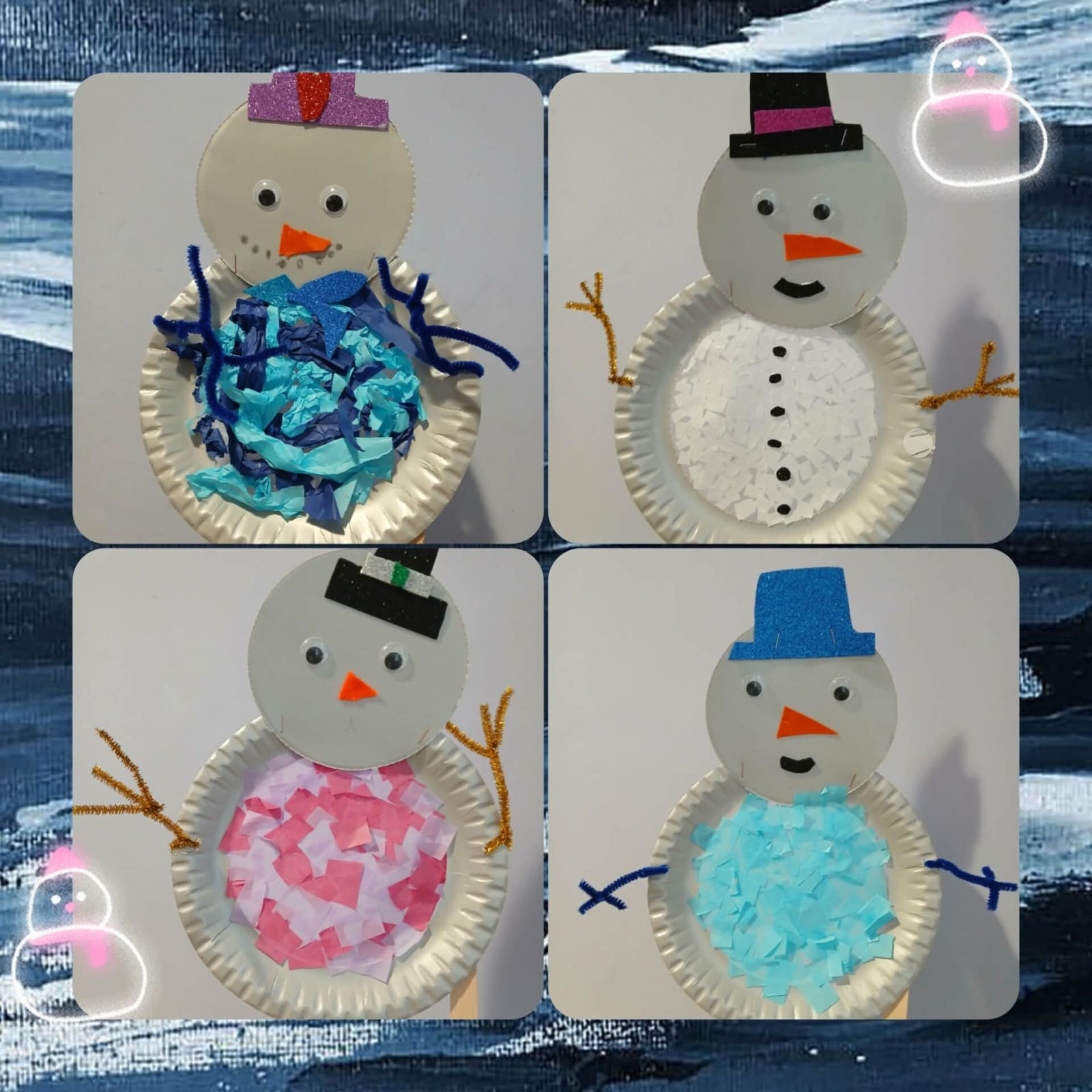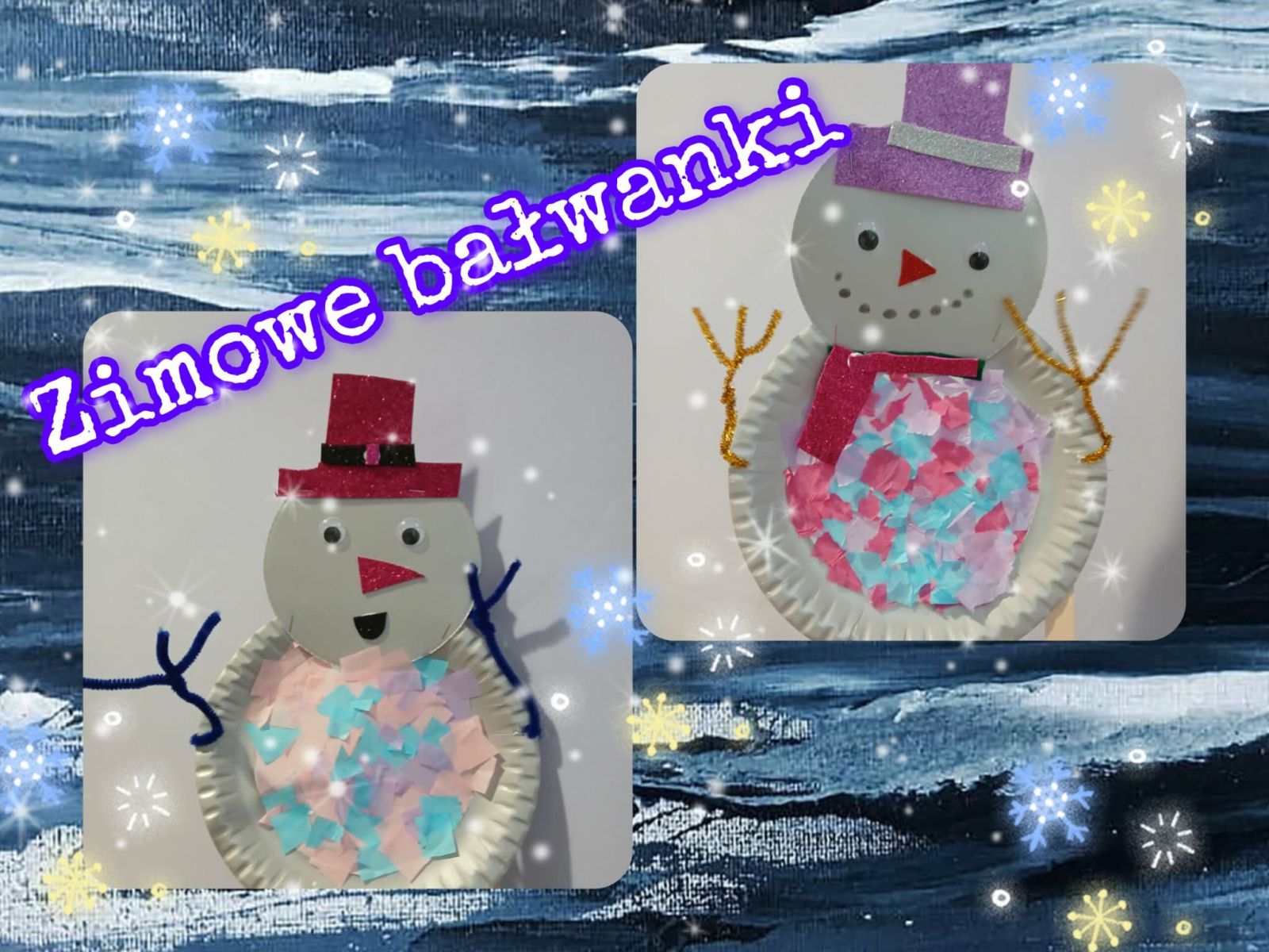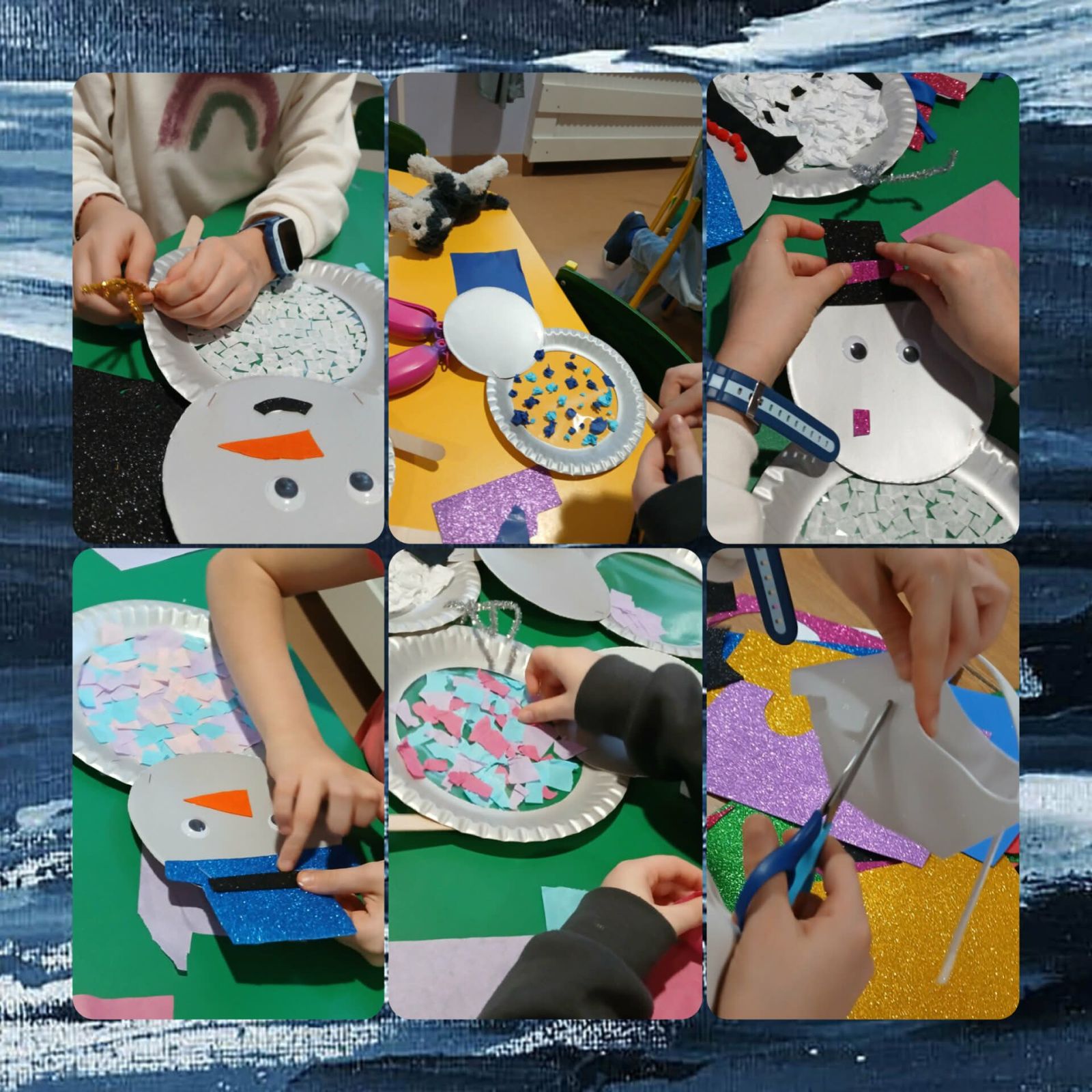 Za oknem zimowa aura, co sprzyja tematycznym pracom plastycznym. W piątkowe przedpołudnie dzieci wykonały wesołe, kolorowe bałwanki. Do pracy wykorzystano papierowy talerzyk, taśmę klejącą i gładką bibułę.