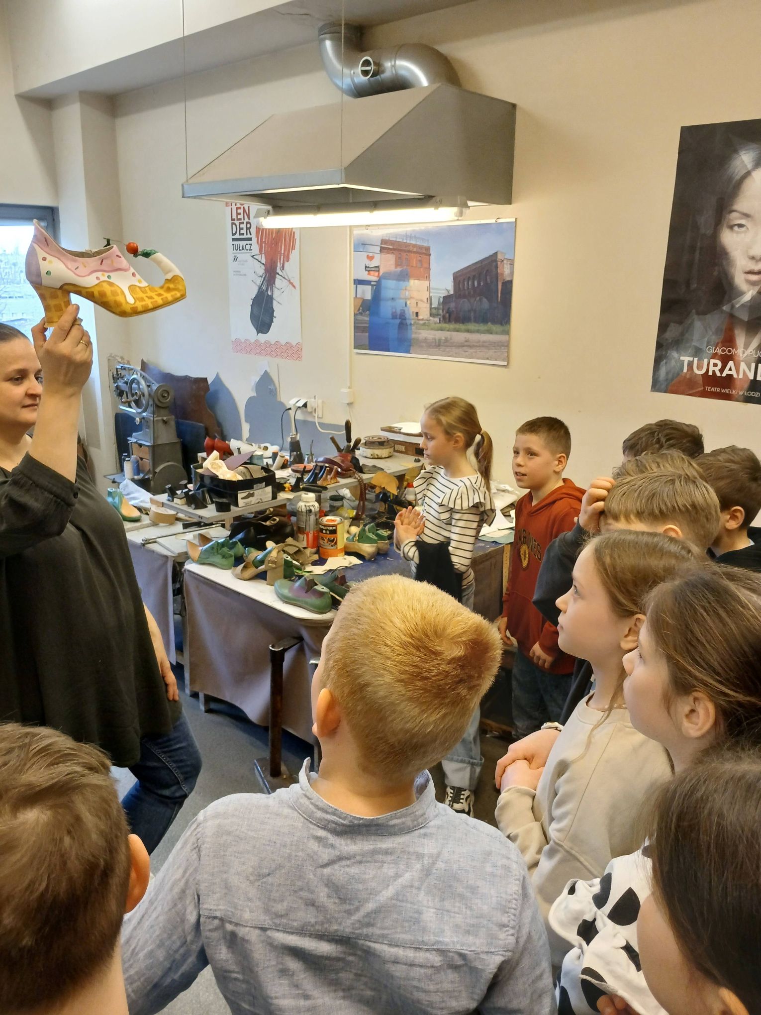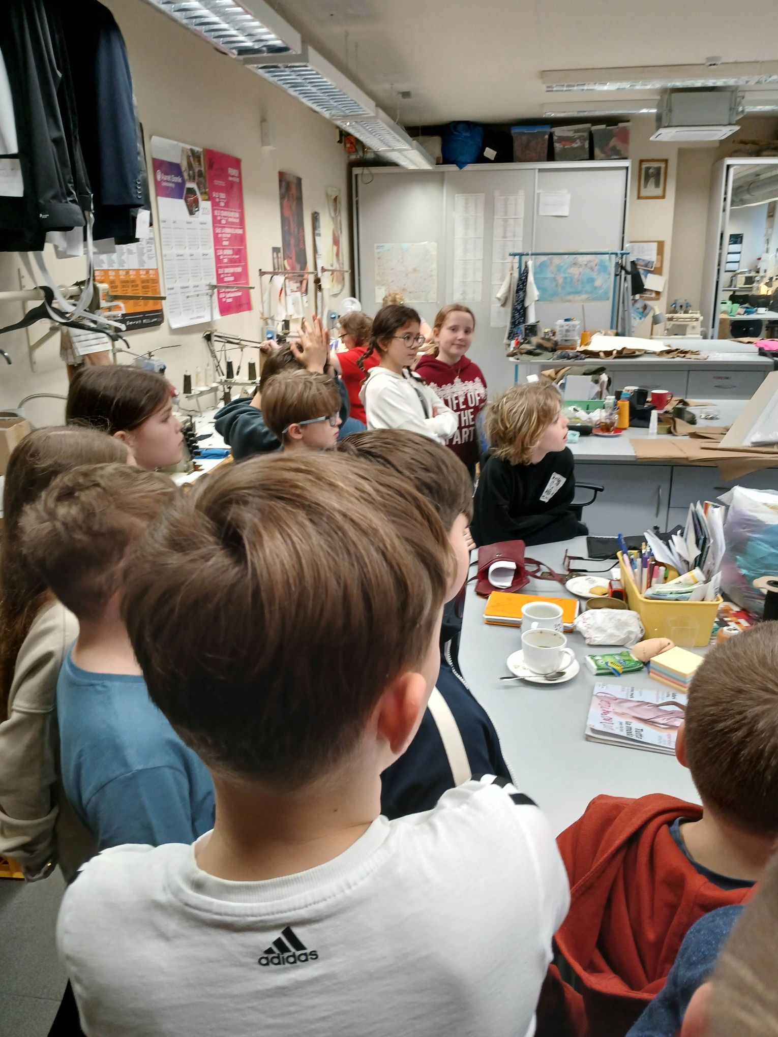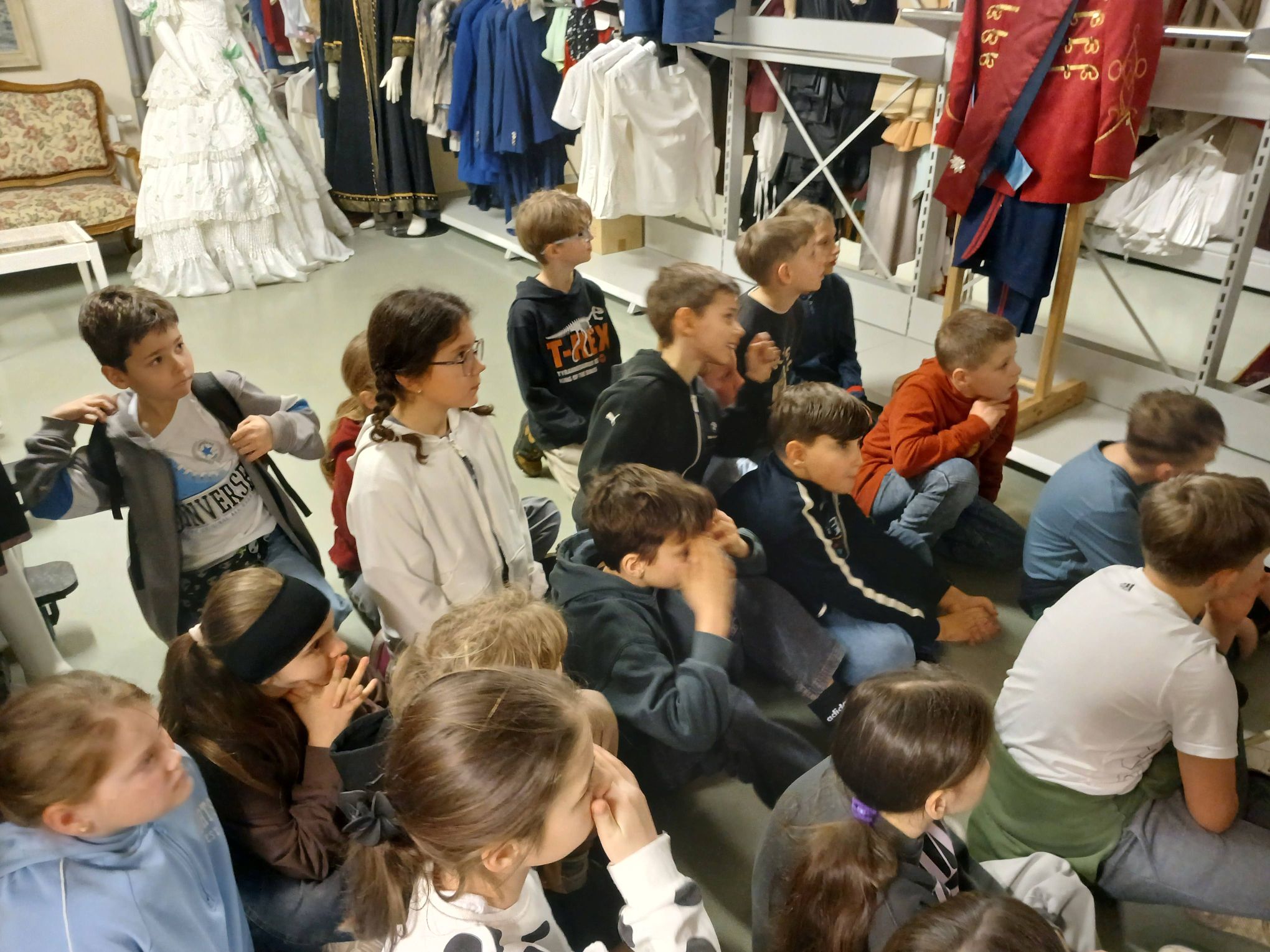 Zwiedziliśmy magazyn kostiumów, poznając sposób ich oznaczania i przechowywania. Zobaczyliśmy także, jak pracują różne pracownie teatralne: krawiecka, szewska i kapelusznicza.