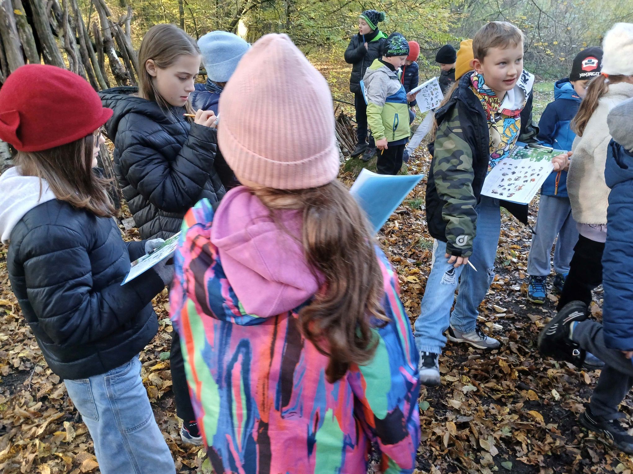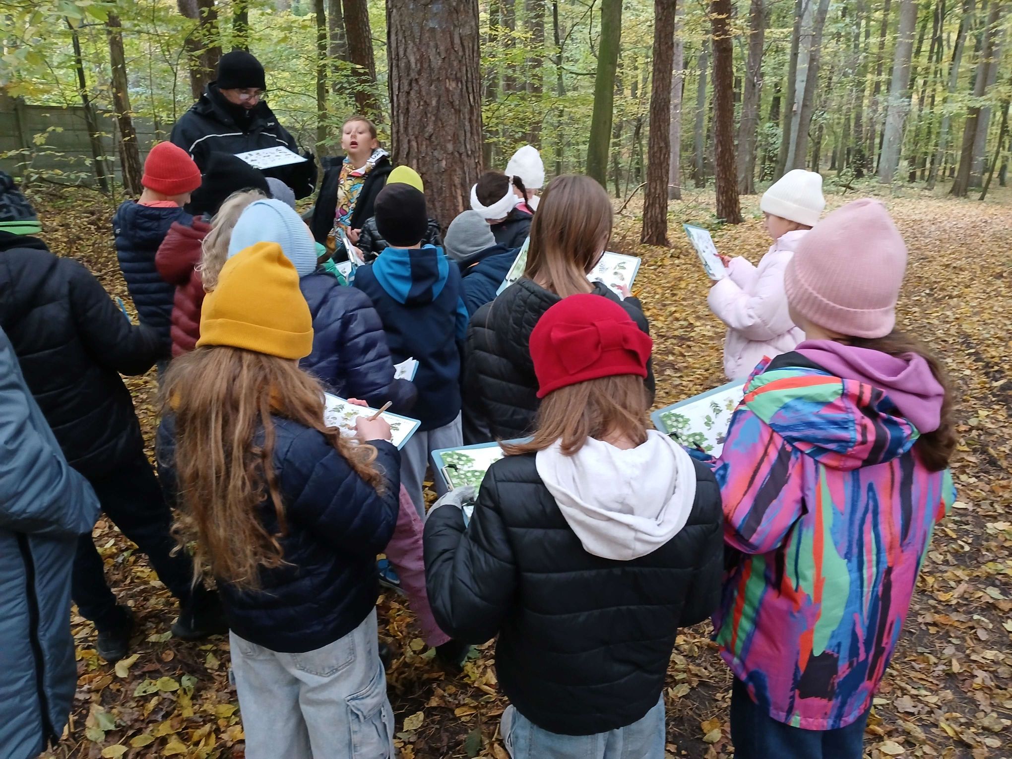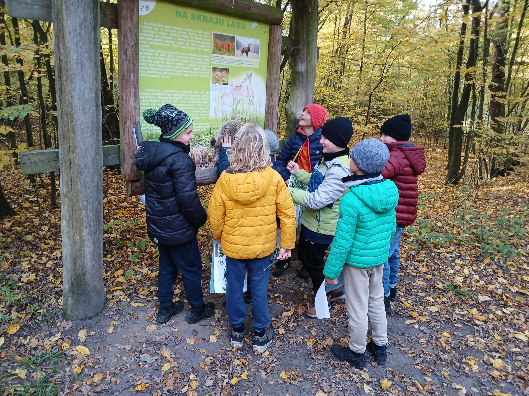 Zajęcia przebiegały w malowniczym otoczeniu lasu w jesiennej szacie. Uczniowie przypisywali różnorodne gatunki drzew, krzewów i roślin oraz zwierząt do poszczególnych warstw lasu, poznając ich cechy i warunki życia. To były ciekawe zajęcia.