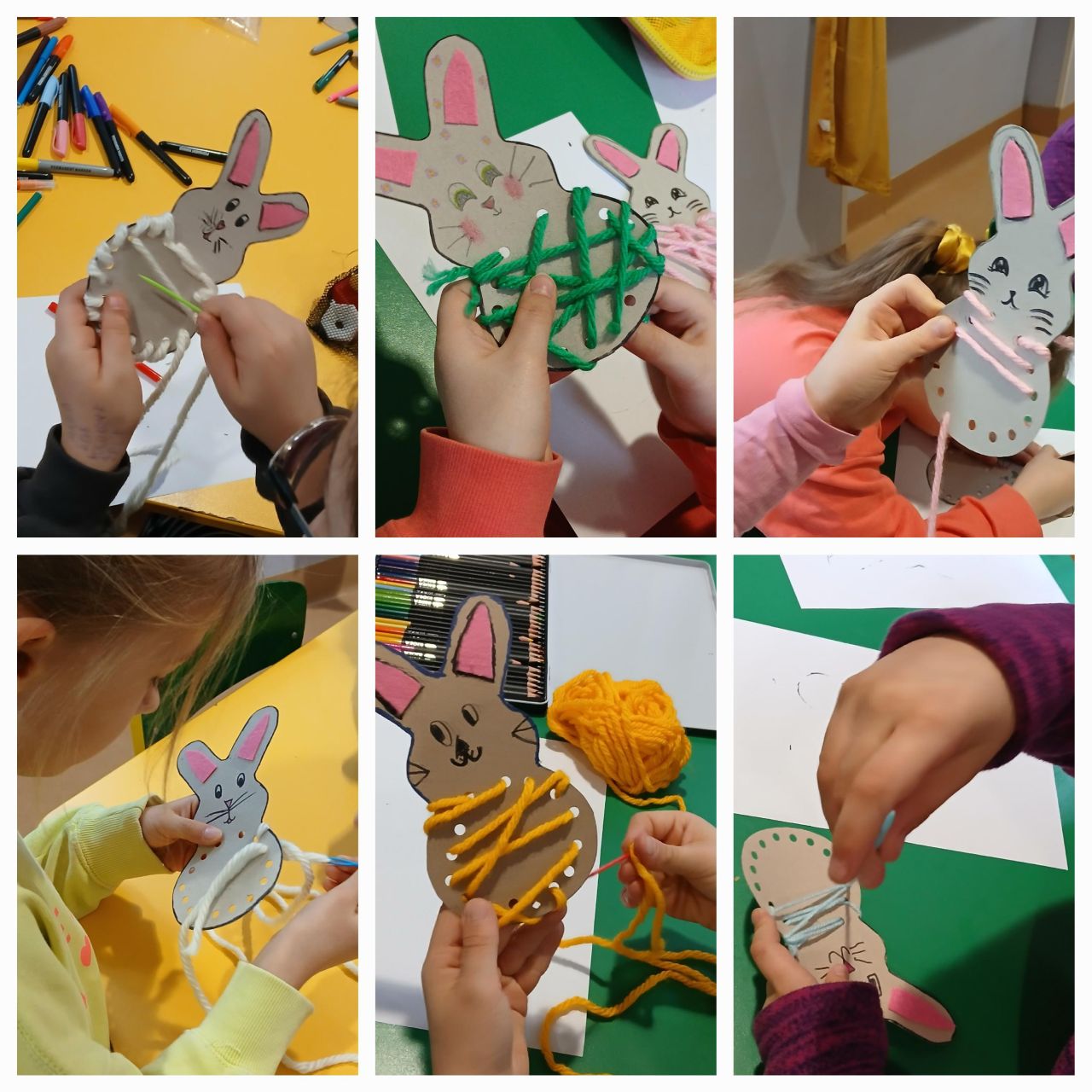 Dzieci przystąpiły do wykonania swoich prac. Każde z nich otrzymało przygotowany wcześniej szablon zajączka z otworami w części brzuszka. Zadaniem było przeplatanie włóczki przez otwory przy użyciu plastikowej igły, tak aby wypełnić brzuch zajączka kolorowym wzorem. Uczniowie samodzielnie dobierali kolory włóczki, rozwijając swoją kreatywność i poczucie estetyki. W trakcie pracy doskonalili sprawność manualną, koordynację wzrokowo-ruchową oraz cierpliwość. Nauczyciel wspierał dzieci, udzielał wskazówek i motywował do starannego wykonania zadania. Zajęcia zakończyły się prezentacją gotowych prac oraz wspólnym podsumowaniem.